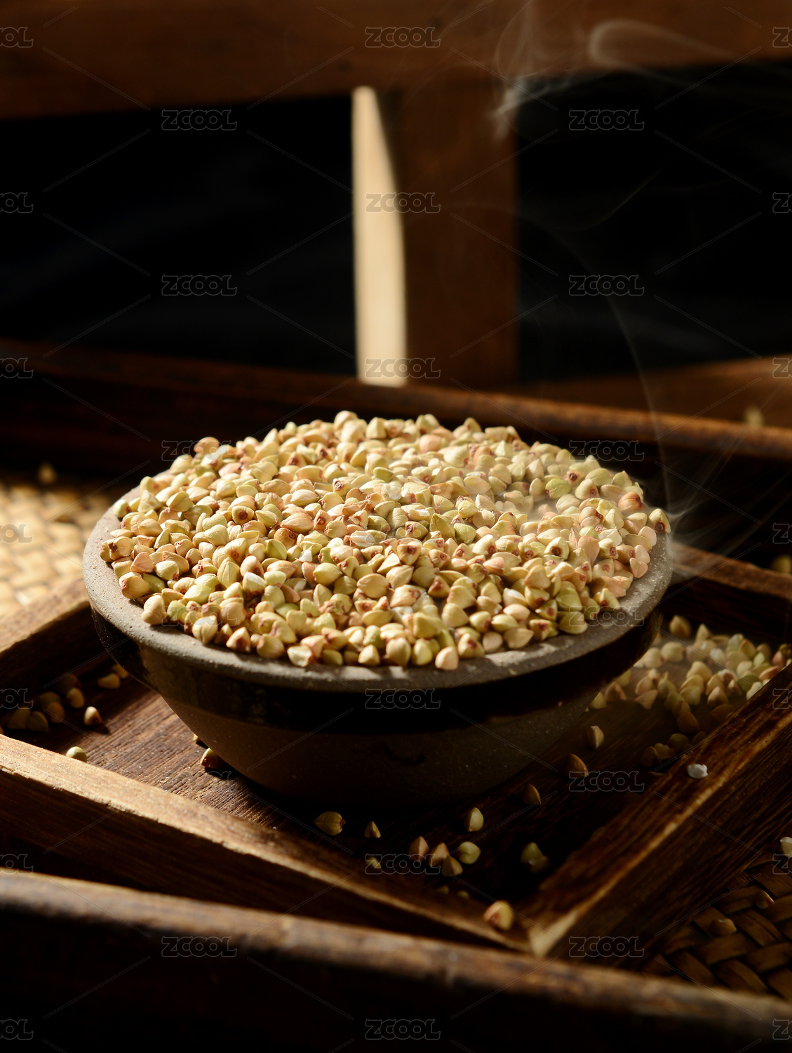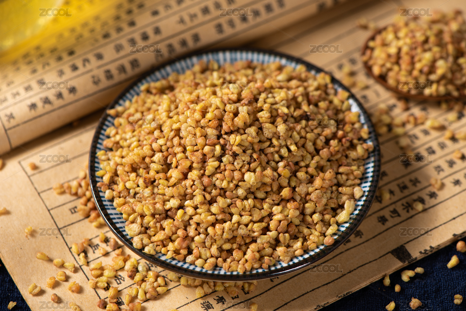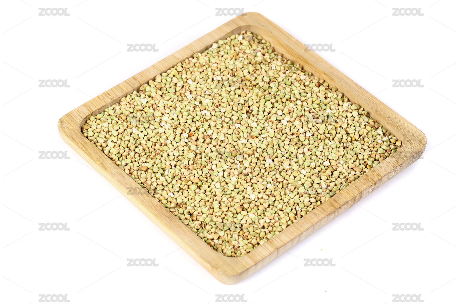 淺色背景下木勺里的蕎麥平鋪