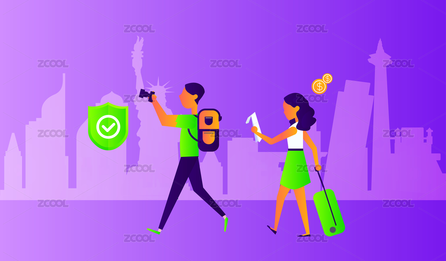 情侶國(guó)外安全旅行旅游扁平矢量插畫