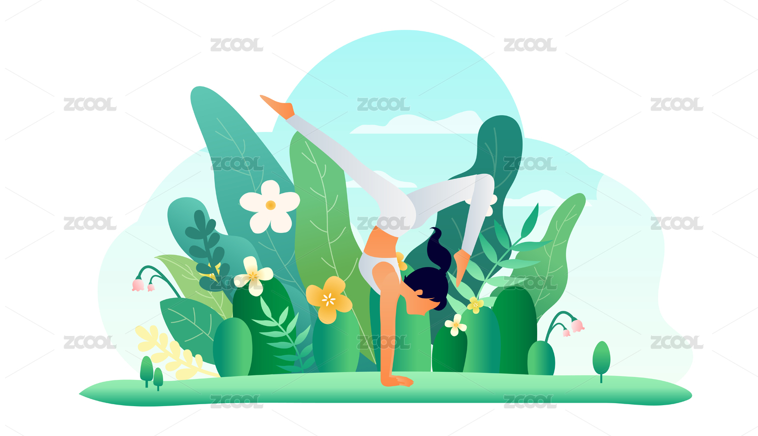 女孩在草地練習(xí)瑜伽鍛煉身體的健身養(yǎng)生插畫
