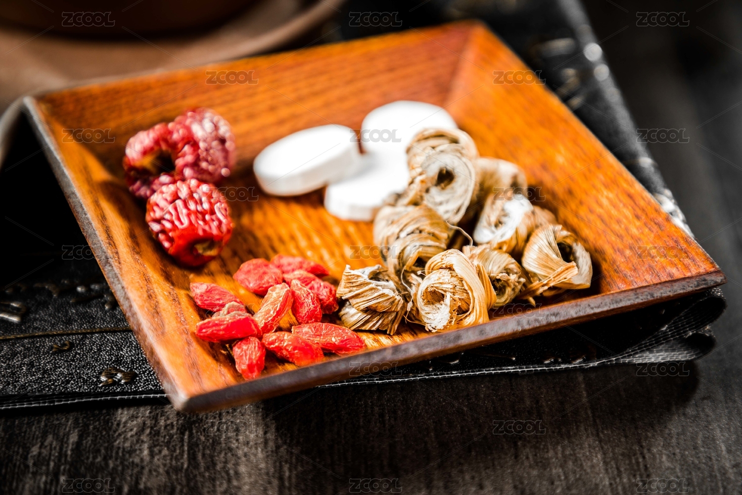 木紋背景上擺放的養(yǎng)生泡腳包
