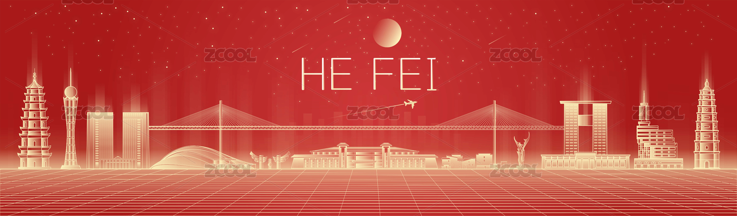 線性紅金科技感安徽地標建筑城市矢量插畫