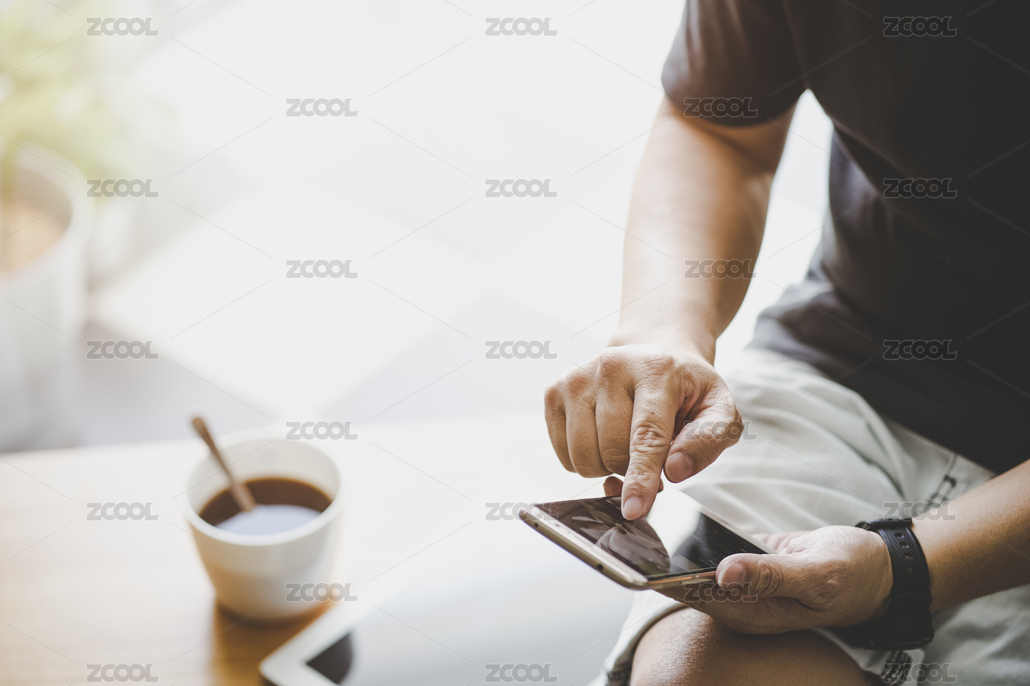 商人喝咖啡和使用手機(jī)特寫