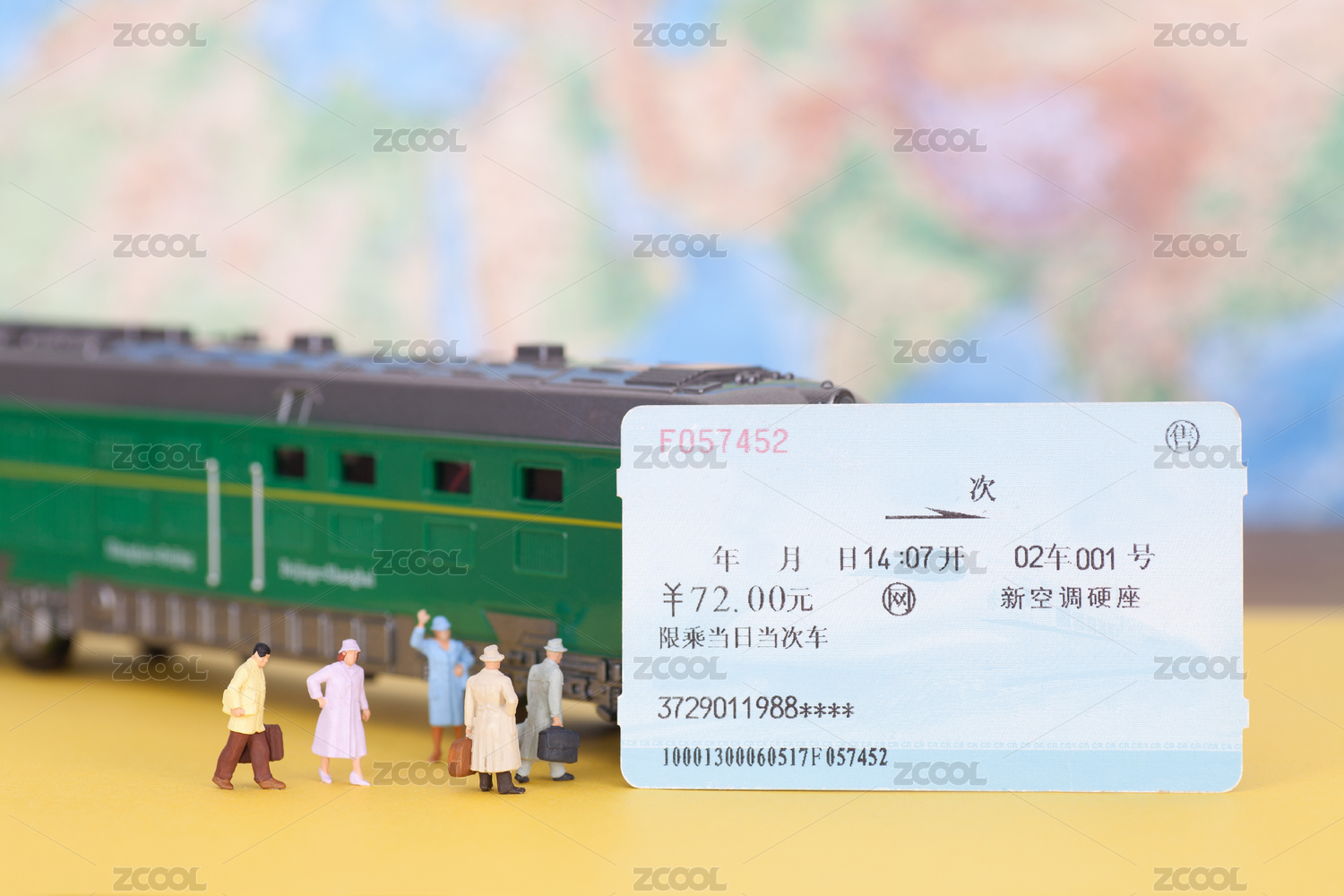 地圖背景前的小火車模型和準(zhǔn)備登火車的小人及一張火車票