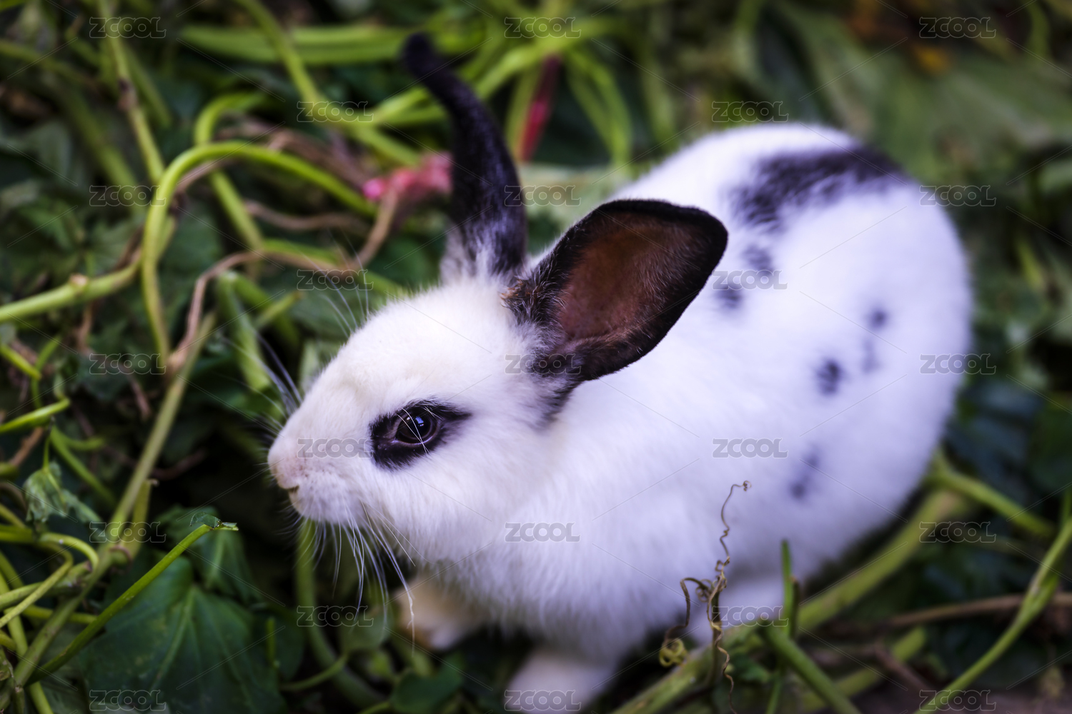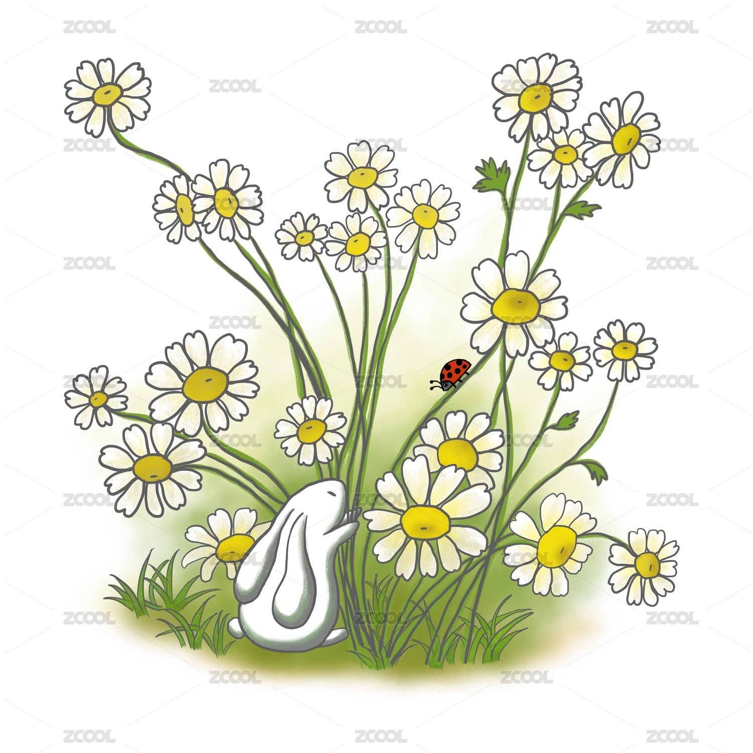 春天小白兔抱著洋甘菊在花叢中和瓢蟲玩耍