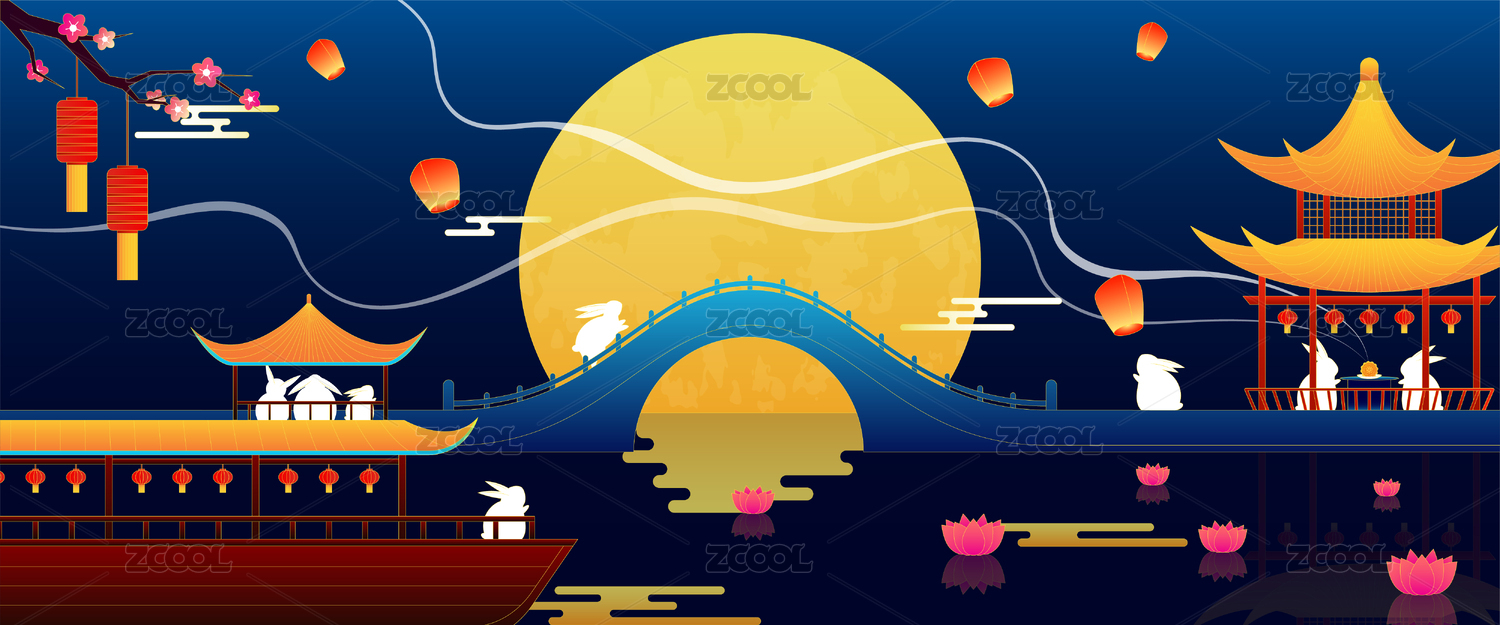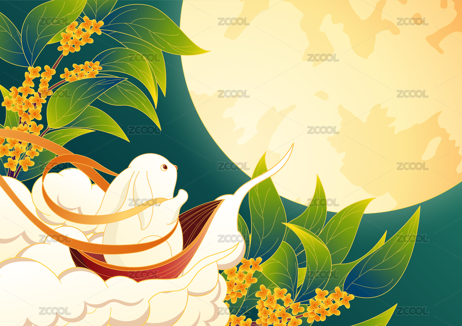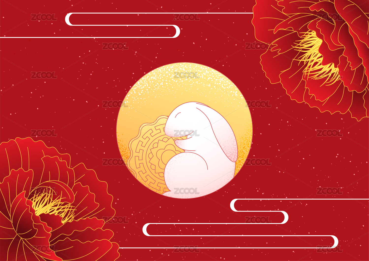 牡丹環(huán)繞月亮中抱著月餅的兔子