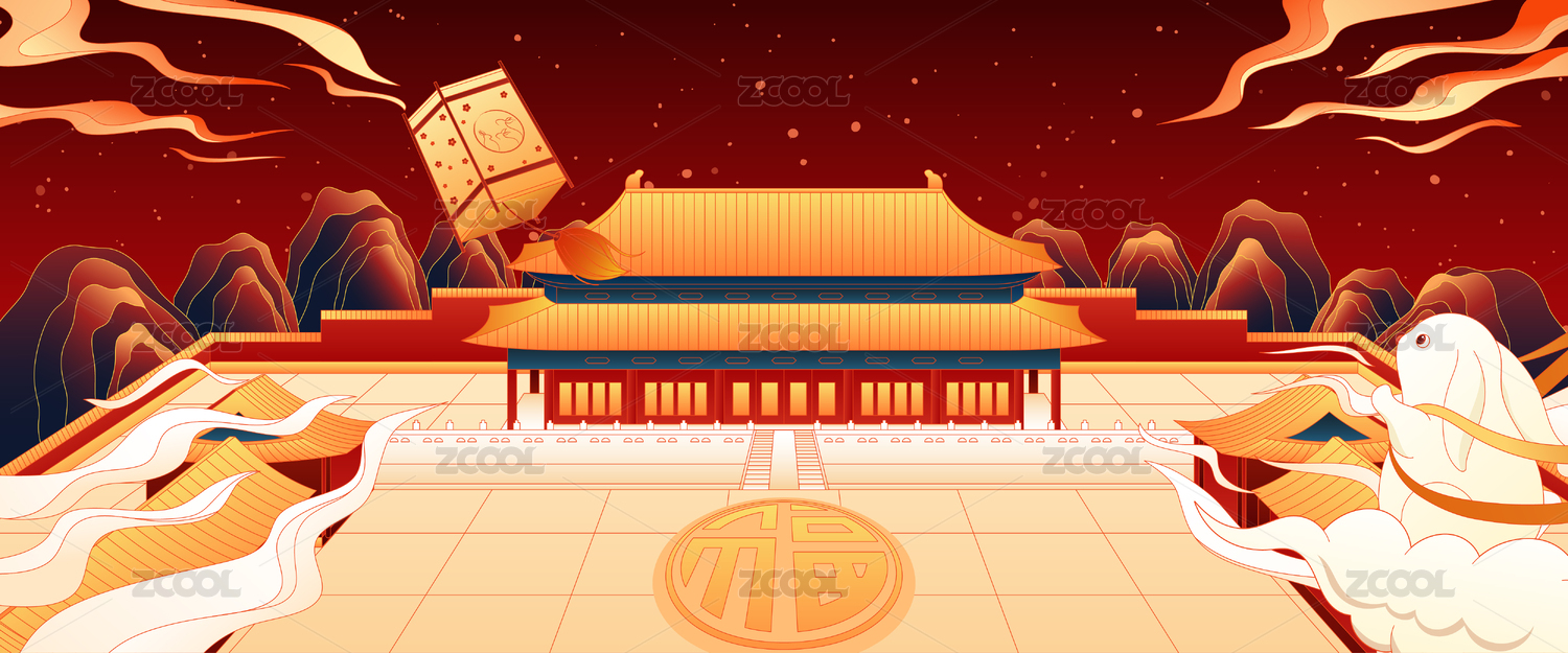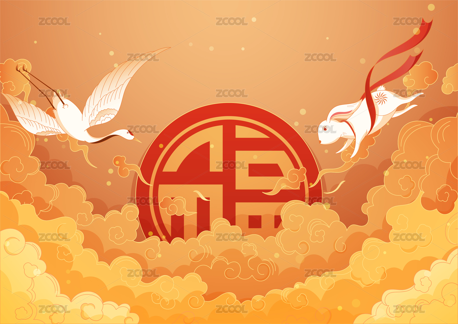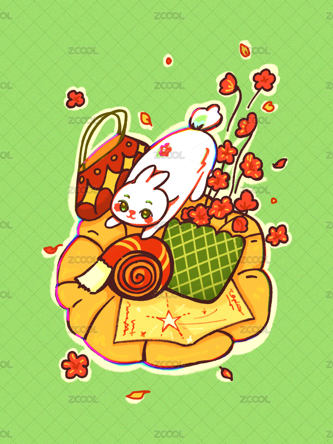 牡丹環(huán)繞月亮中抱著月餅的兔子