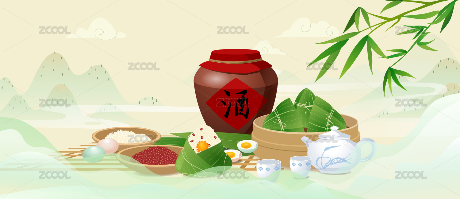 端午節(jié)山水美酒粽子鴨蛋糯米插畫矢量圖