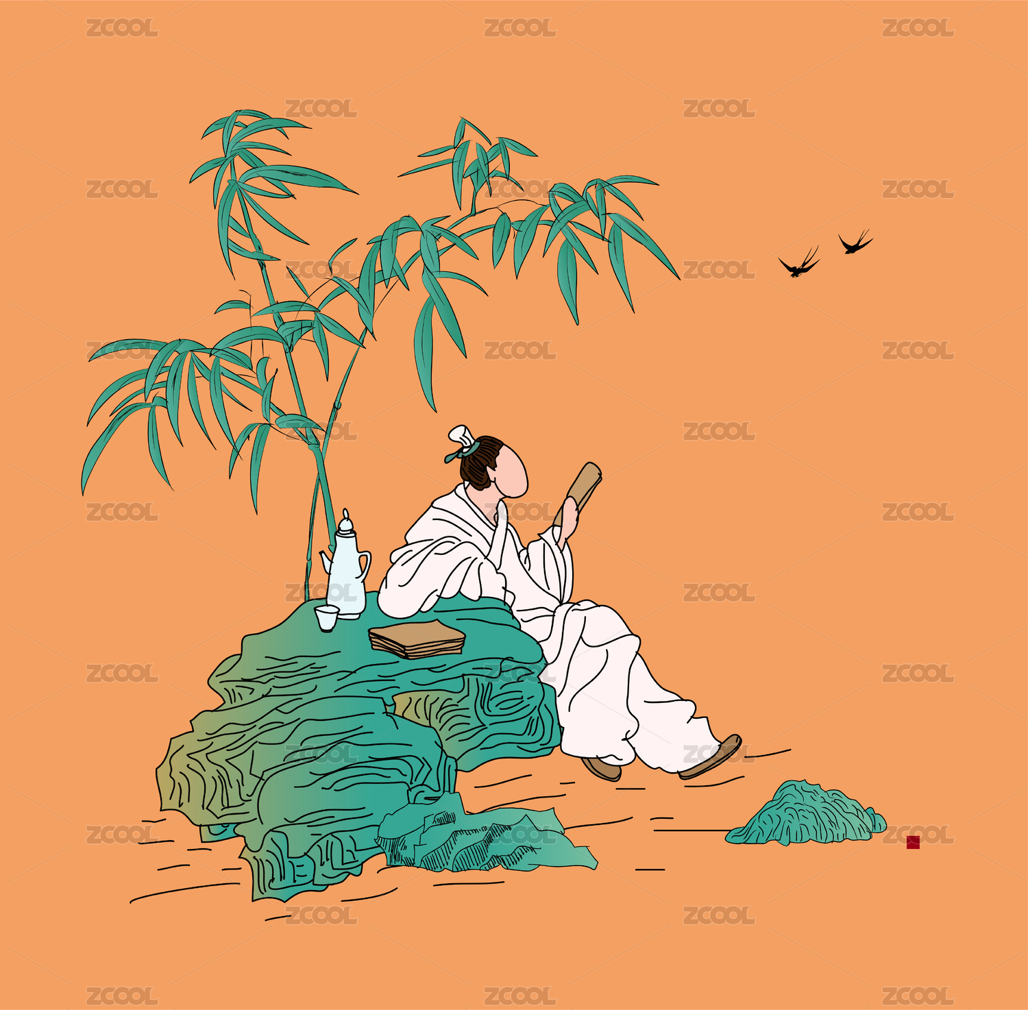 古風(fēng)竹間山石書生美酒矢量國潮手繪插畫