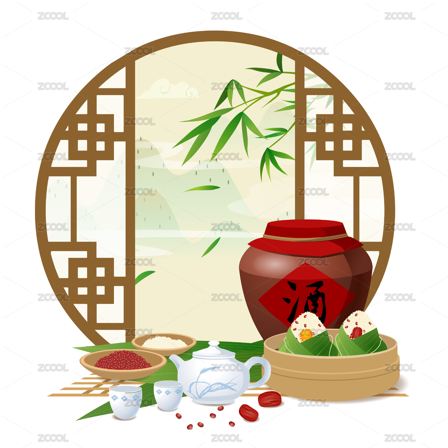 端午節(jié)窗邊山水美酒粽子糯米古風(fēng)插畫矢量圖
