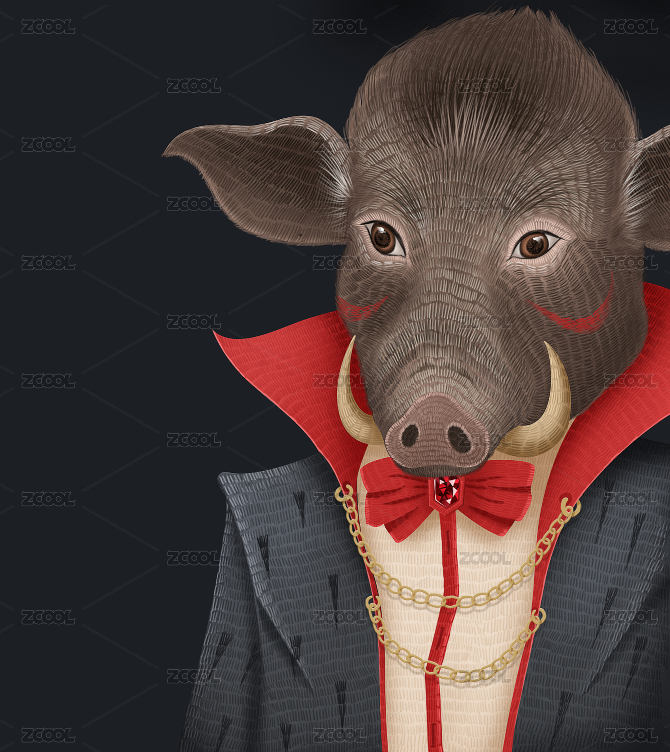 黑色背景下野豬穿著禮服的肖像