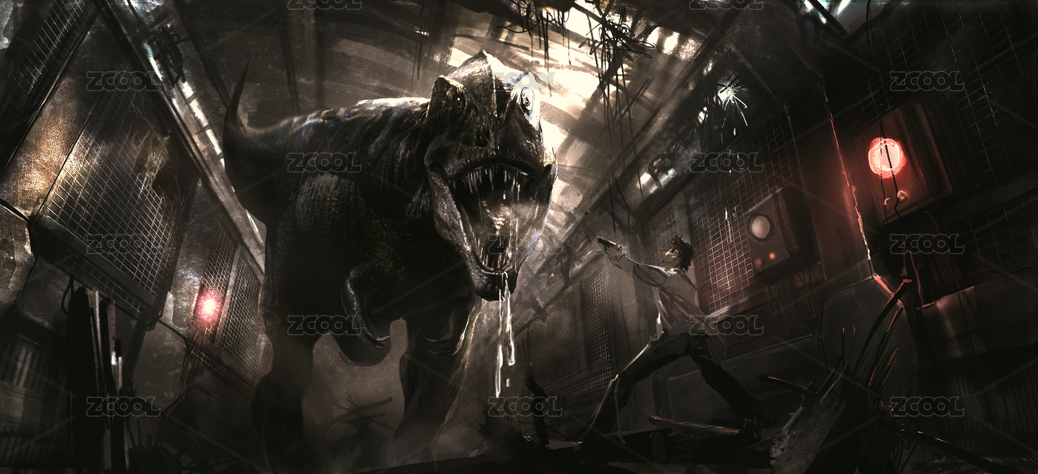 恐龍襲擊人類額度場(chǎng)景,數(shù)字繪畫。