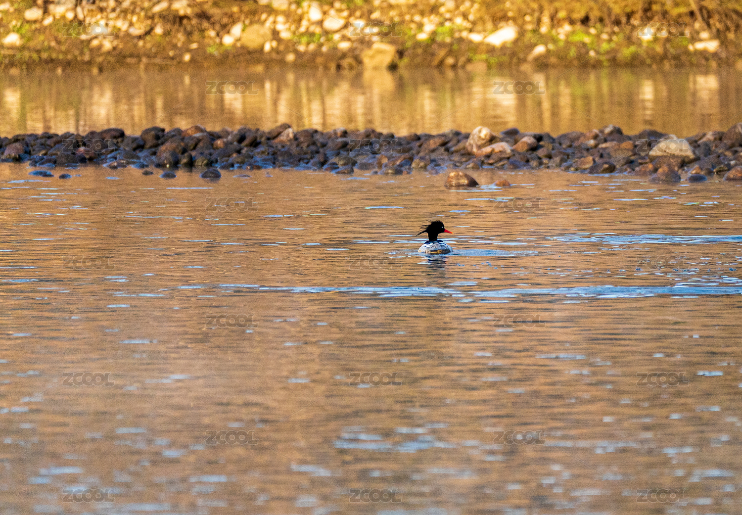 絲綢般的藍(lán)色大海上一只發(fā)型超酷的秋沙鴨