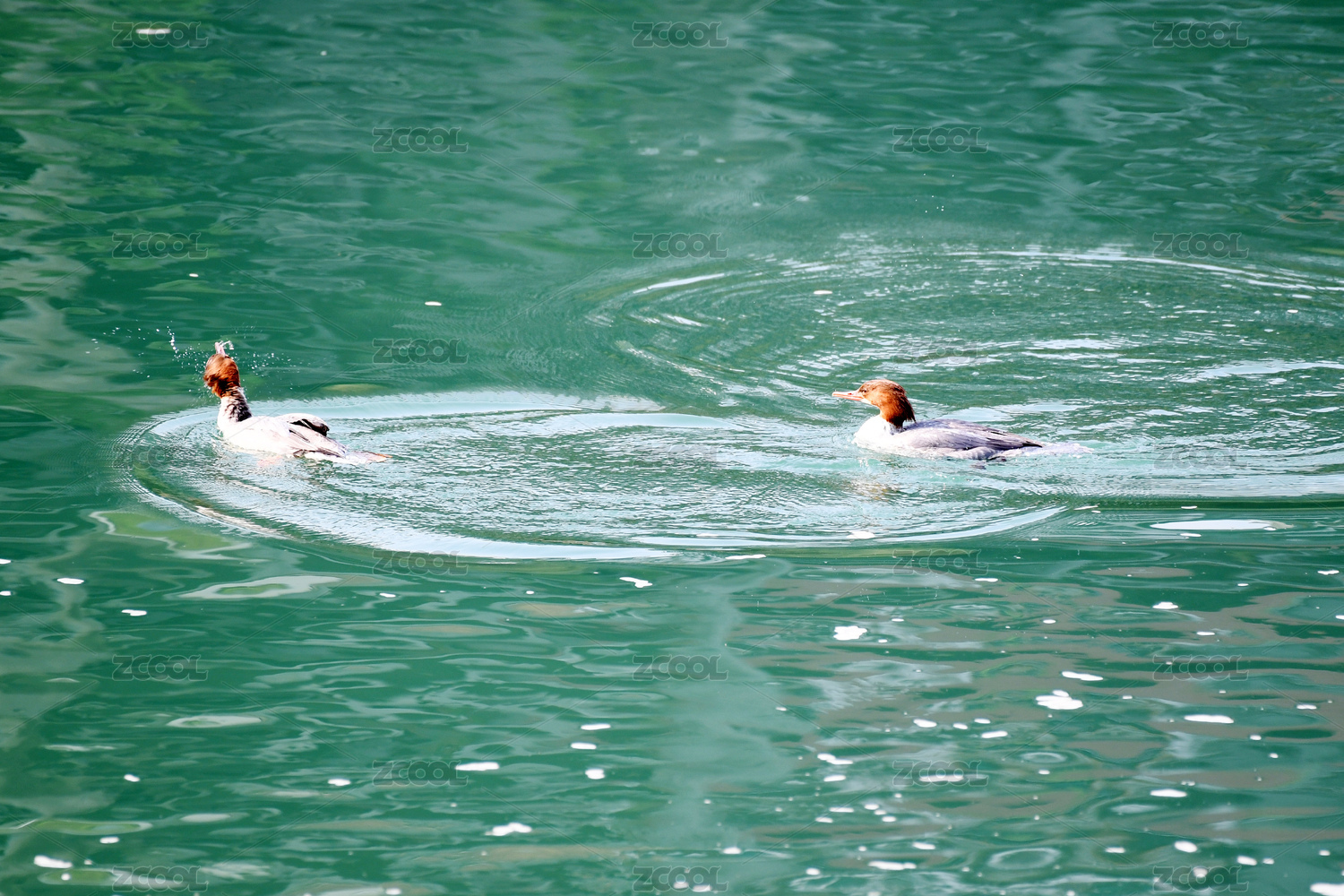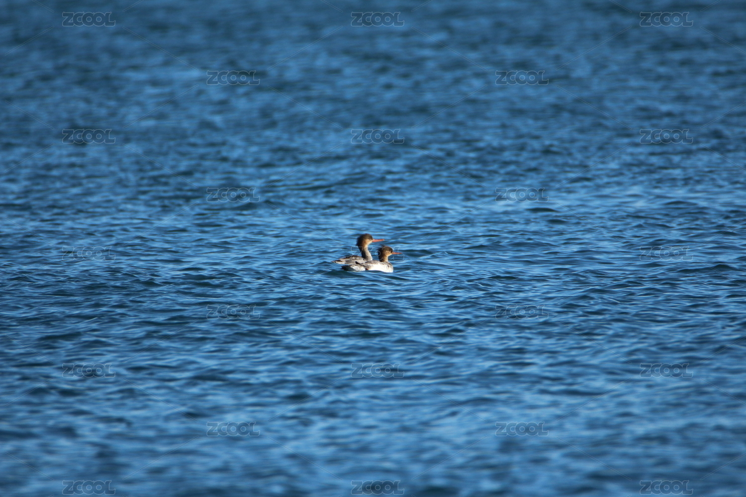 絲滑的藍(lán)色海面上兩只結(jié)伴前行的秋沙鴨