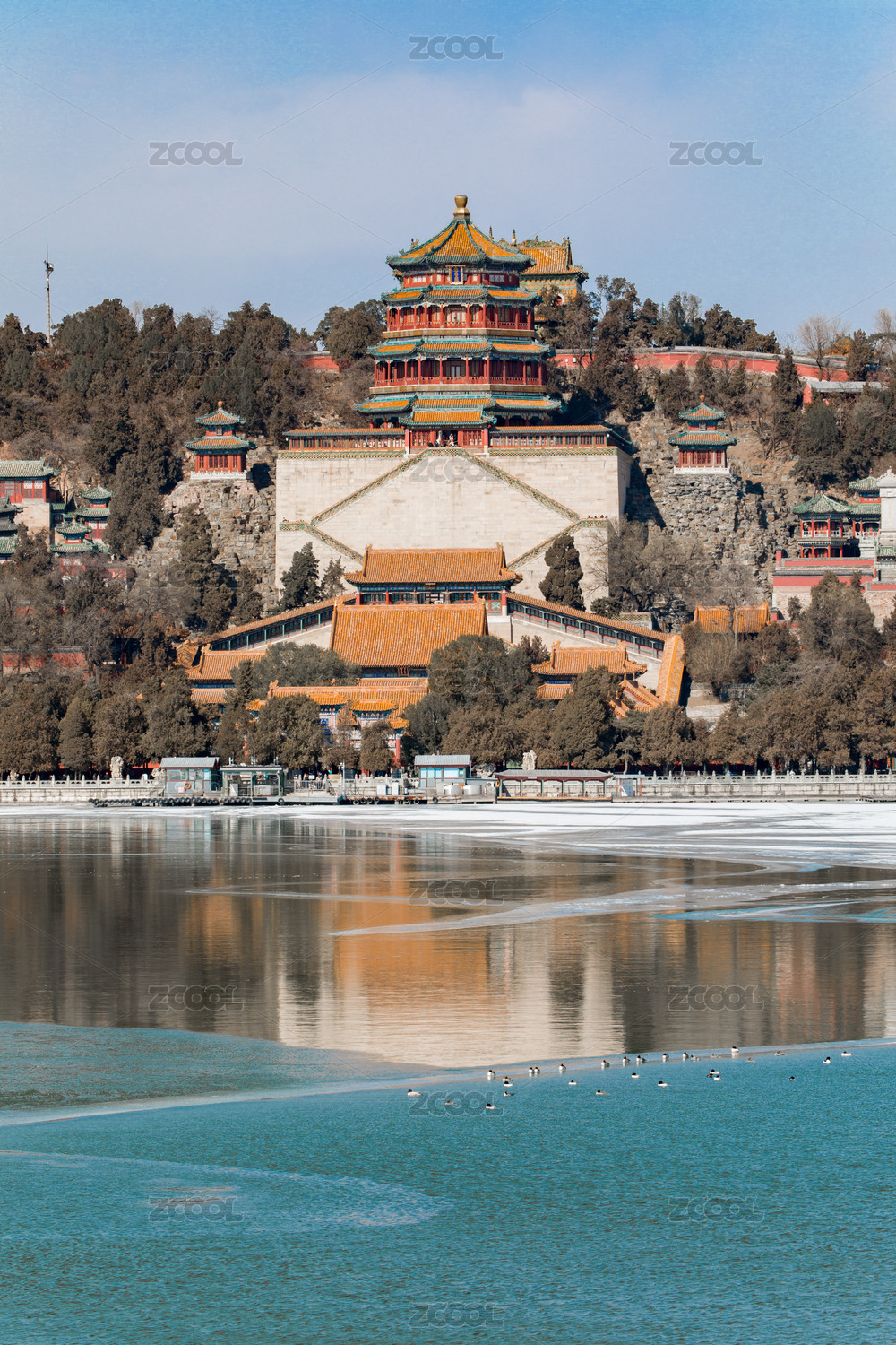 中國北京頤和園萬壽山佛香閣昆明湖秋沙鴨