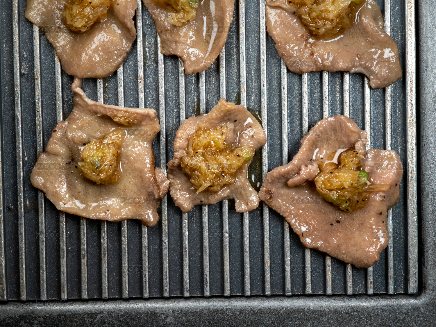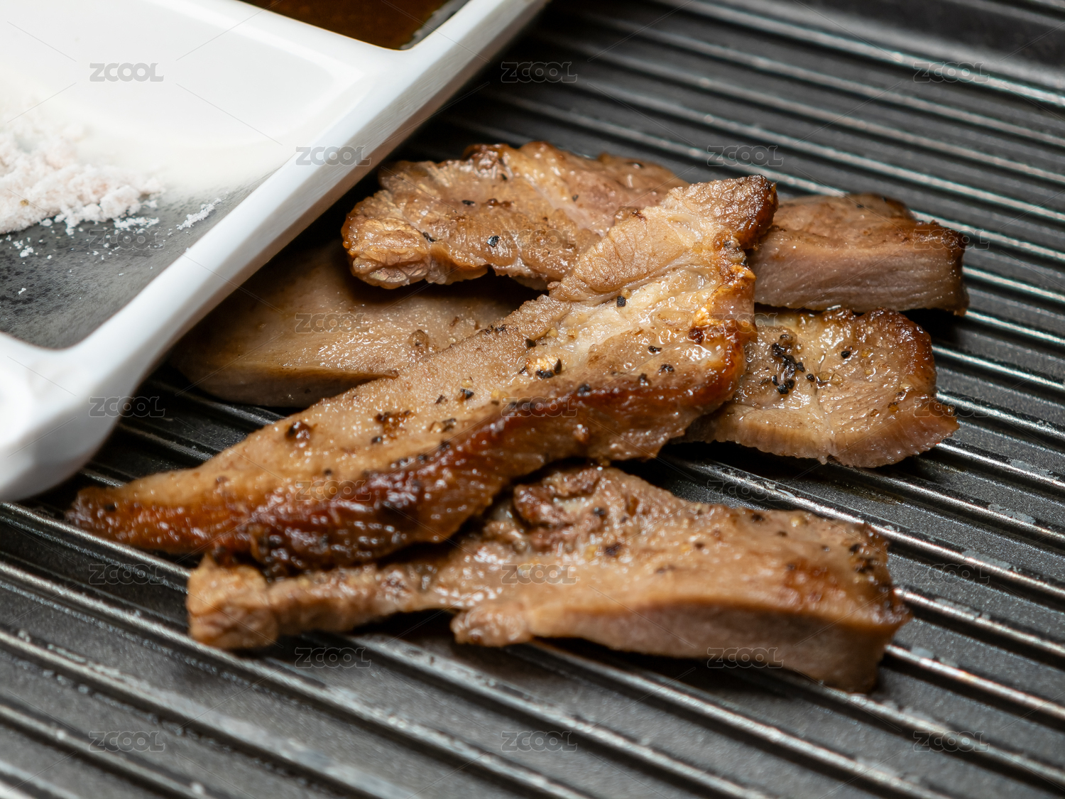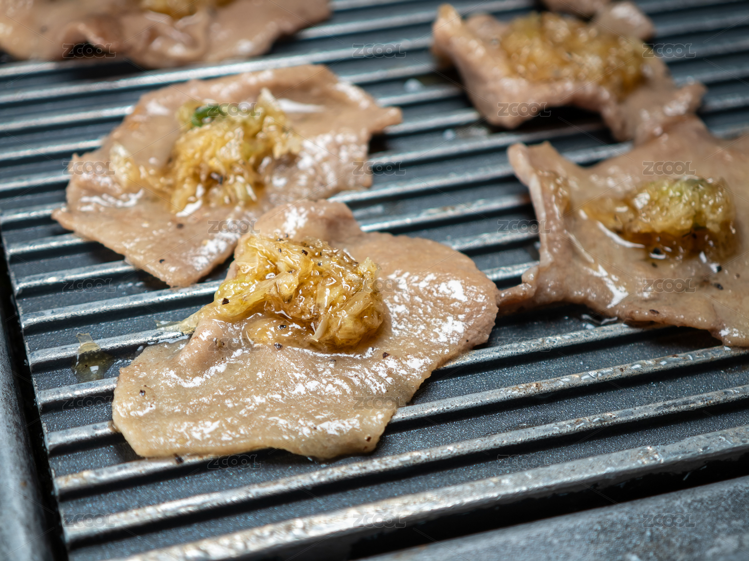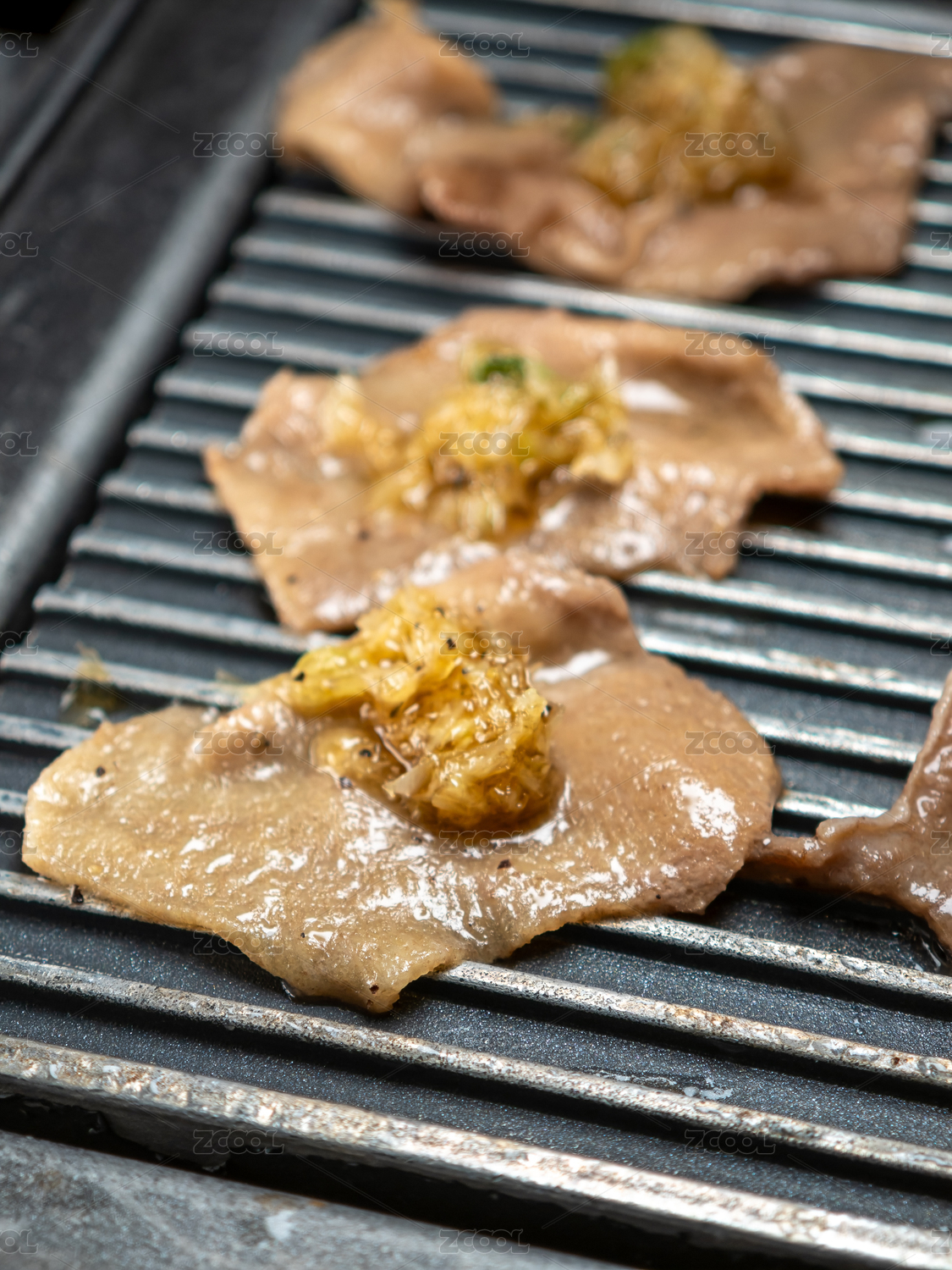 日式燒肉鐵板上的美味蔥鹽烤牛舌特寫