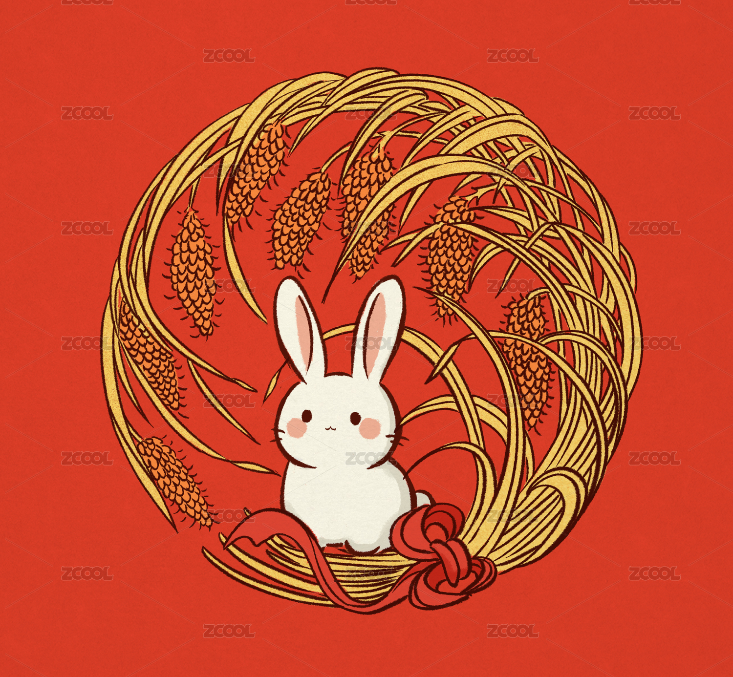 兔子和金色麥穗歲歲平安手繪插畫(huà)