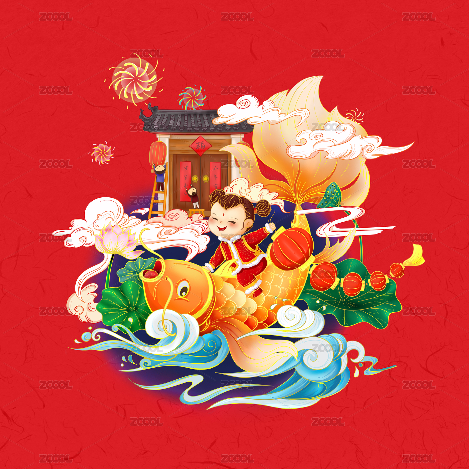 小孩騎著鯉魚(yú)年年有余歲歲平安年畫(huà)方版