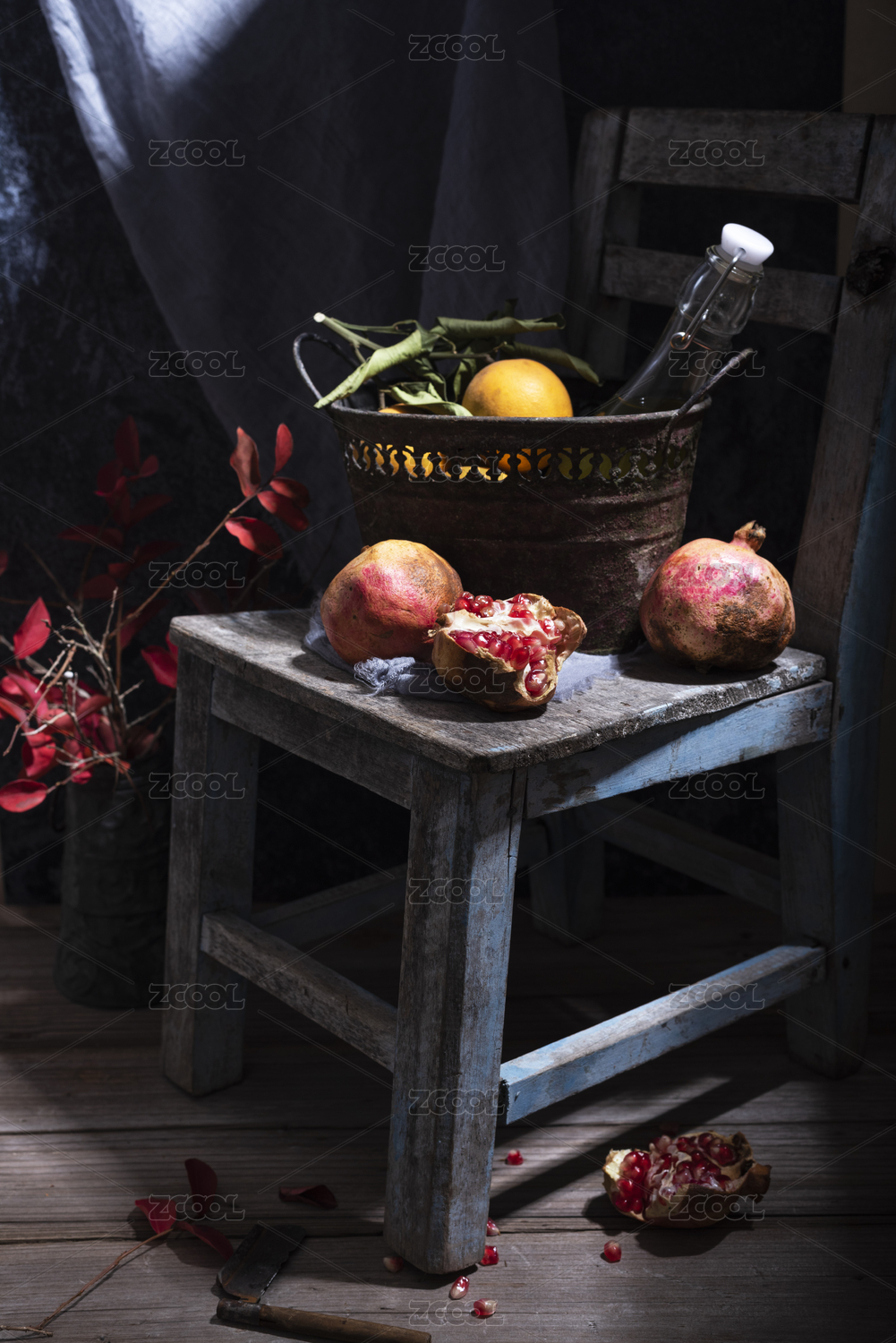 散落在做舊青藍(lán)色木質(zhì)椅的紅石榴