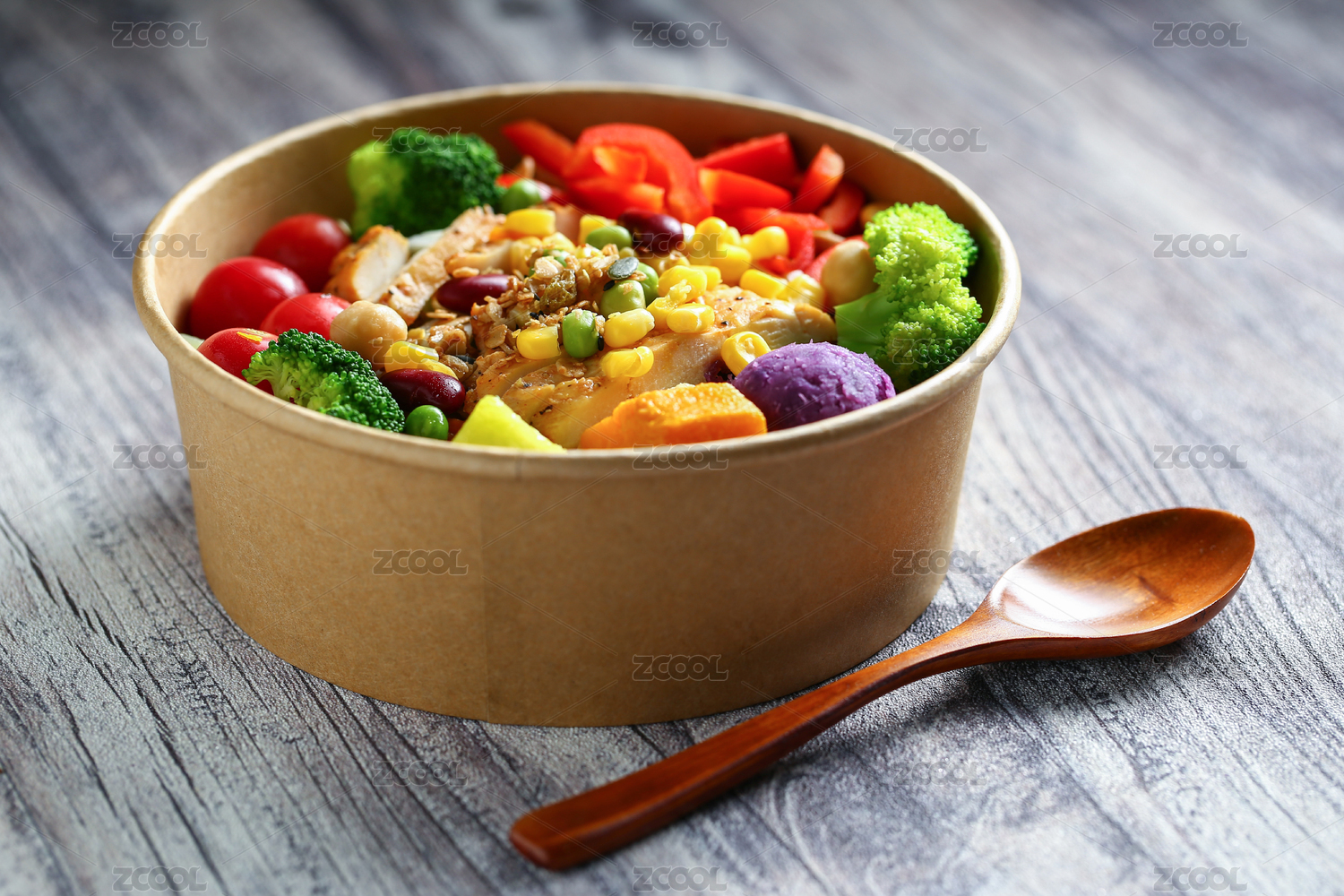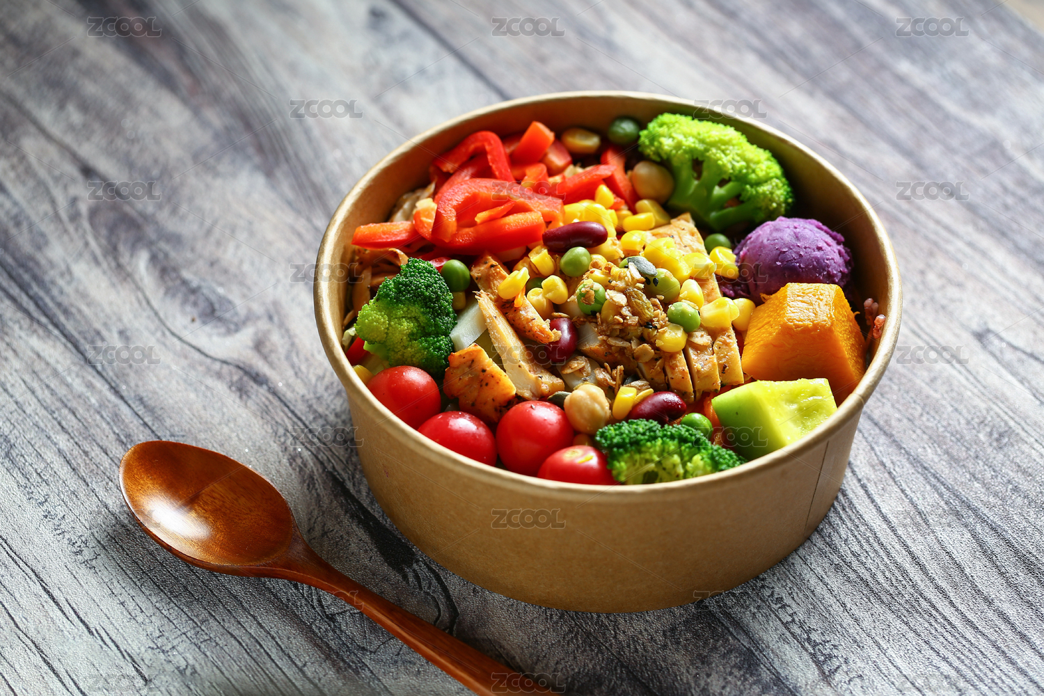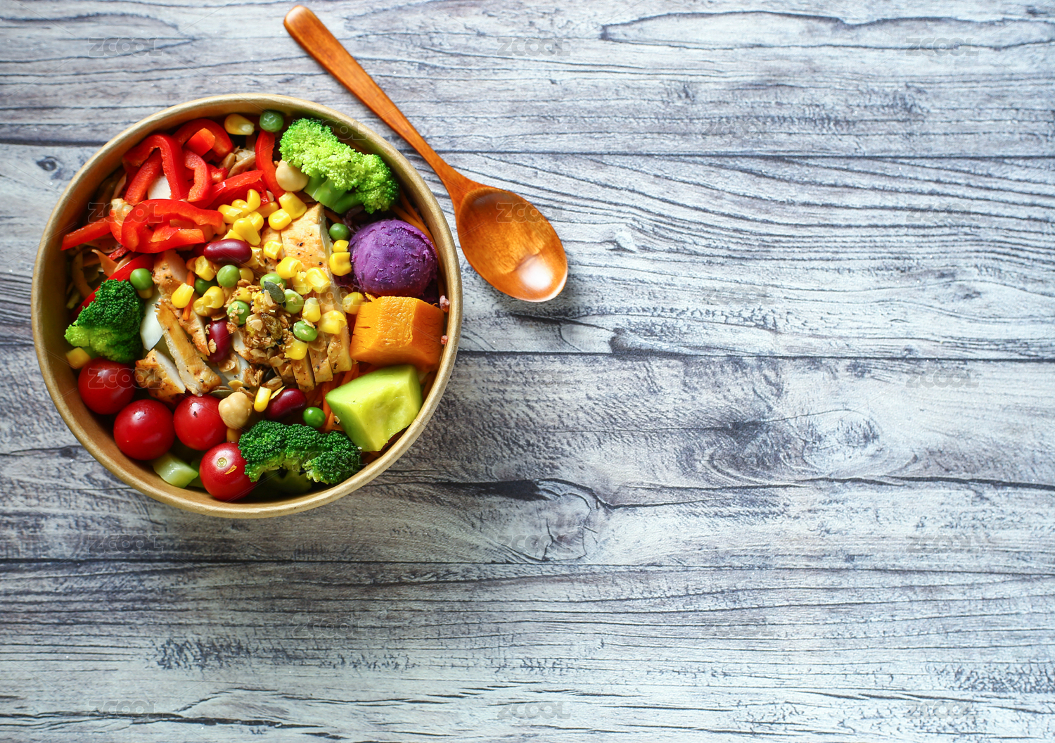番茄蔬菜沙拉雞排飯和木勺放在復(fù)古做舊紋理木板桌子上