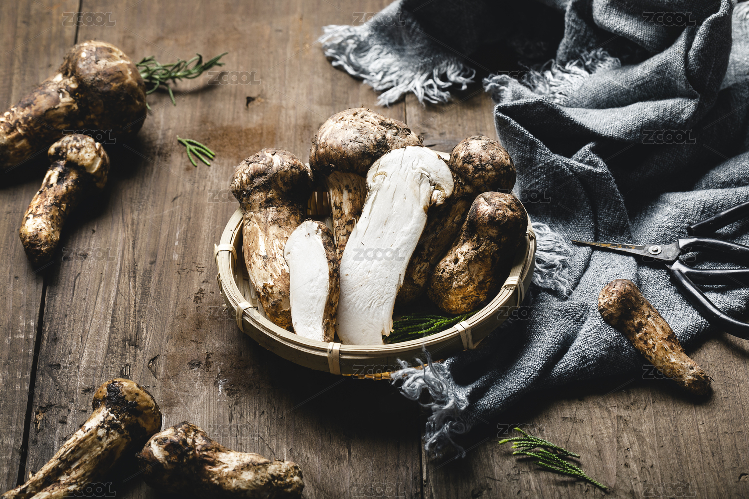 做舊風(fēng)格放在竹籃里的松茸切片
