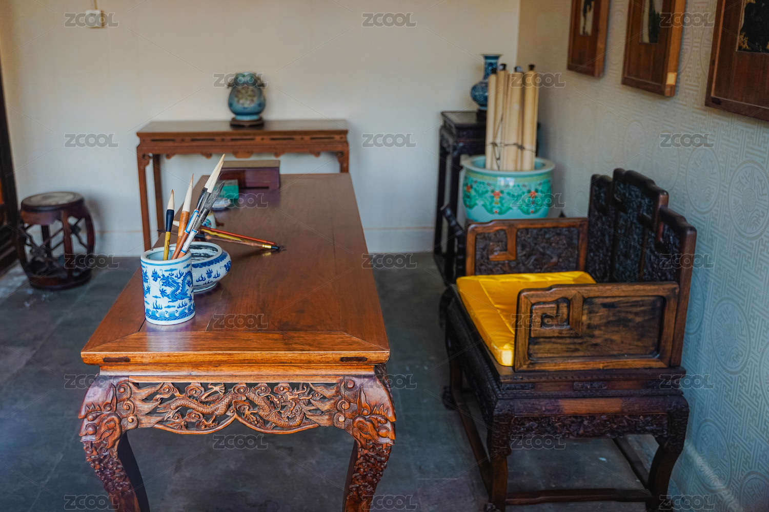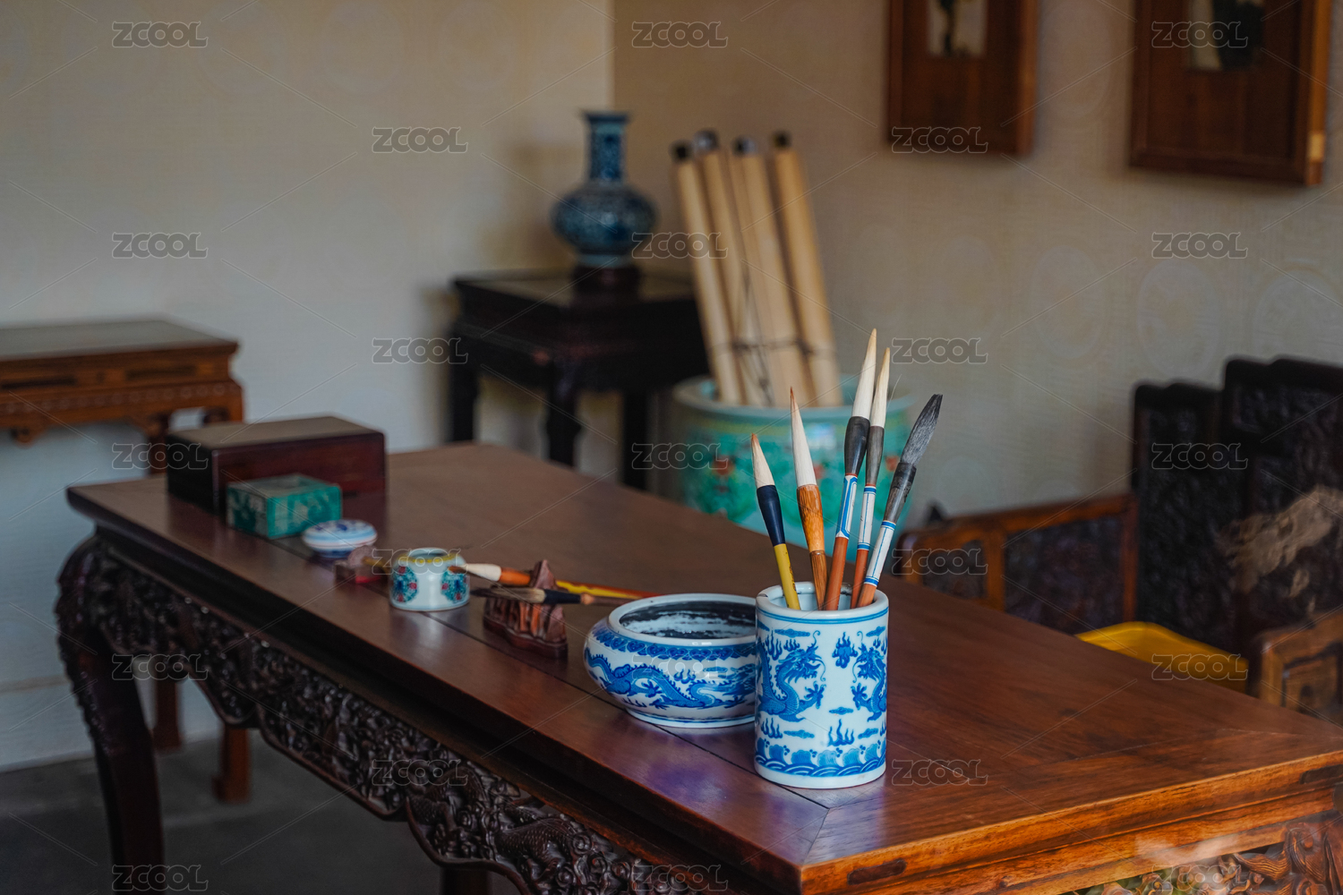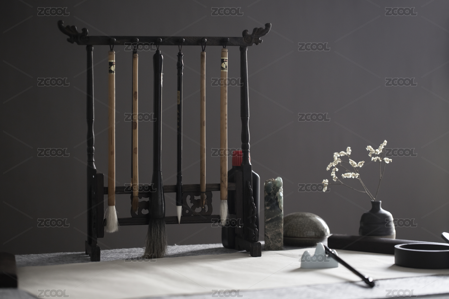 放好的毛筆和古書籍及旁邊卷軸書畫作品