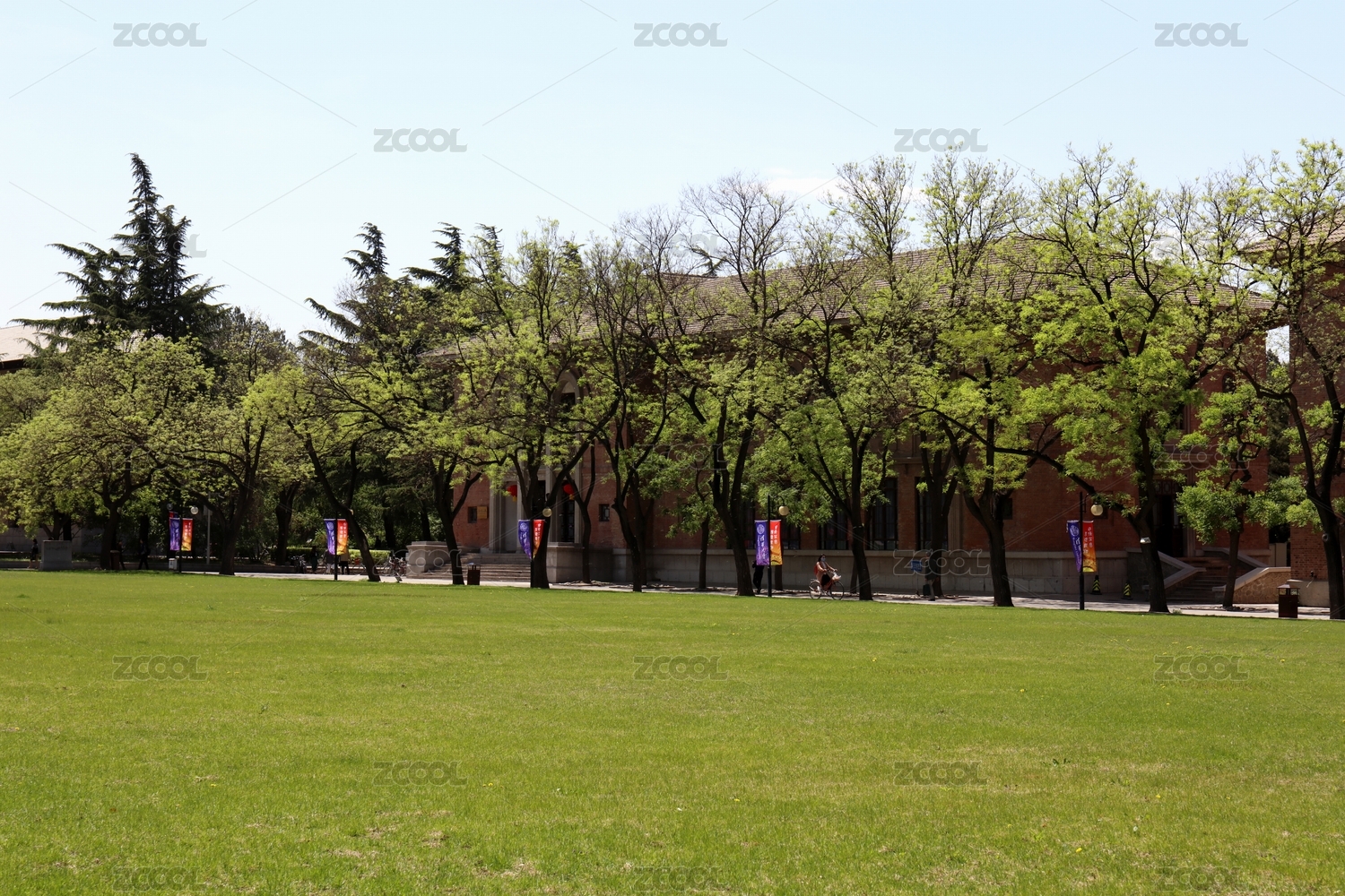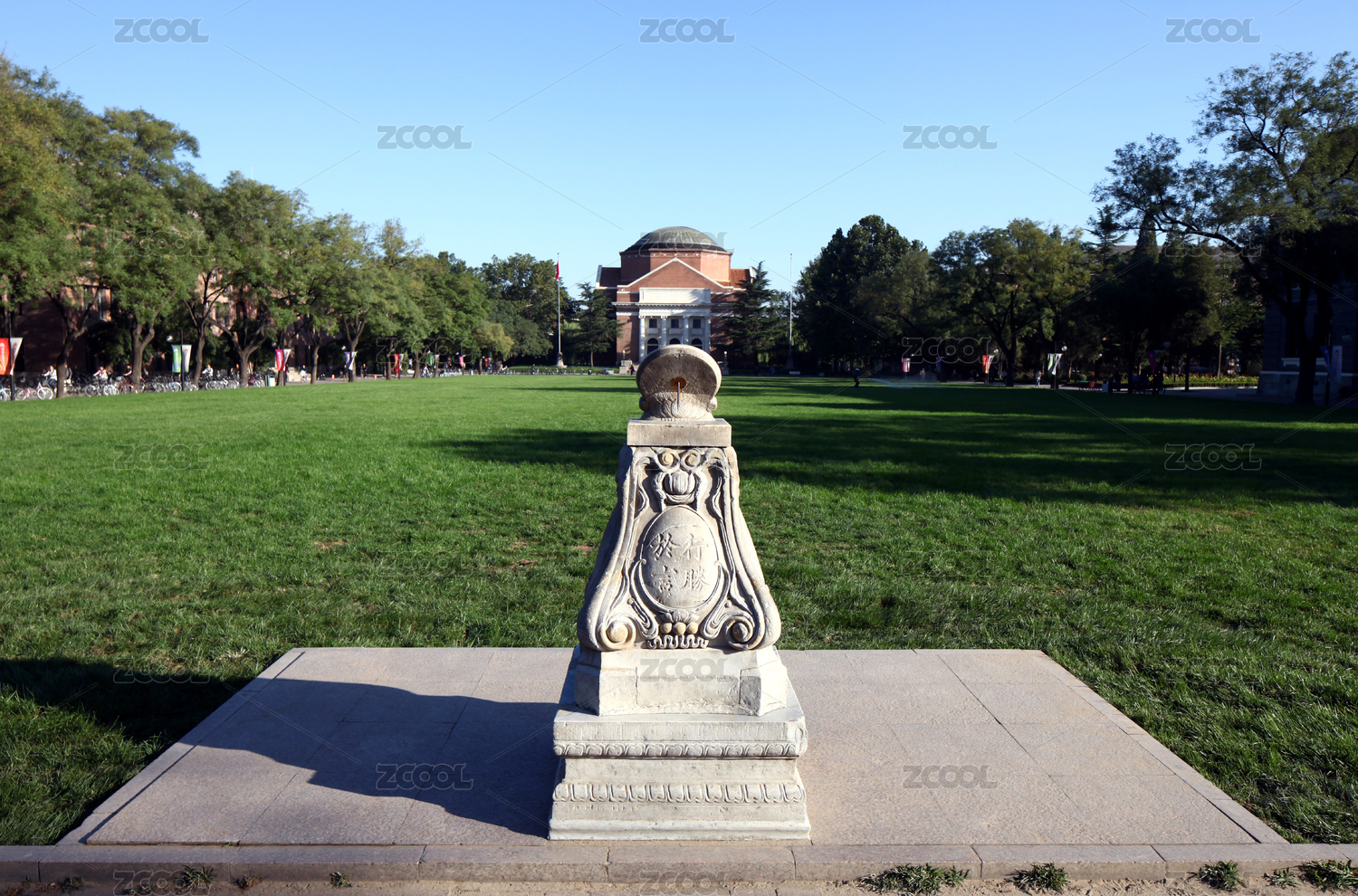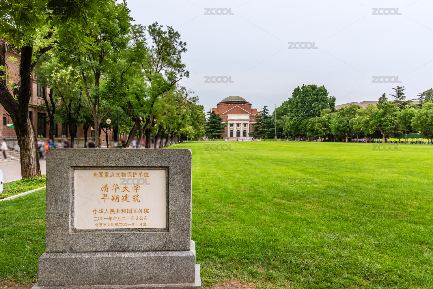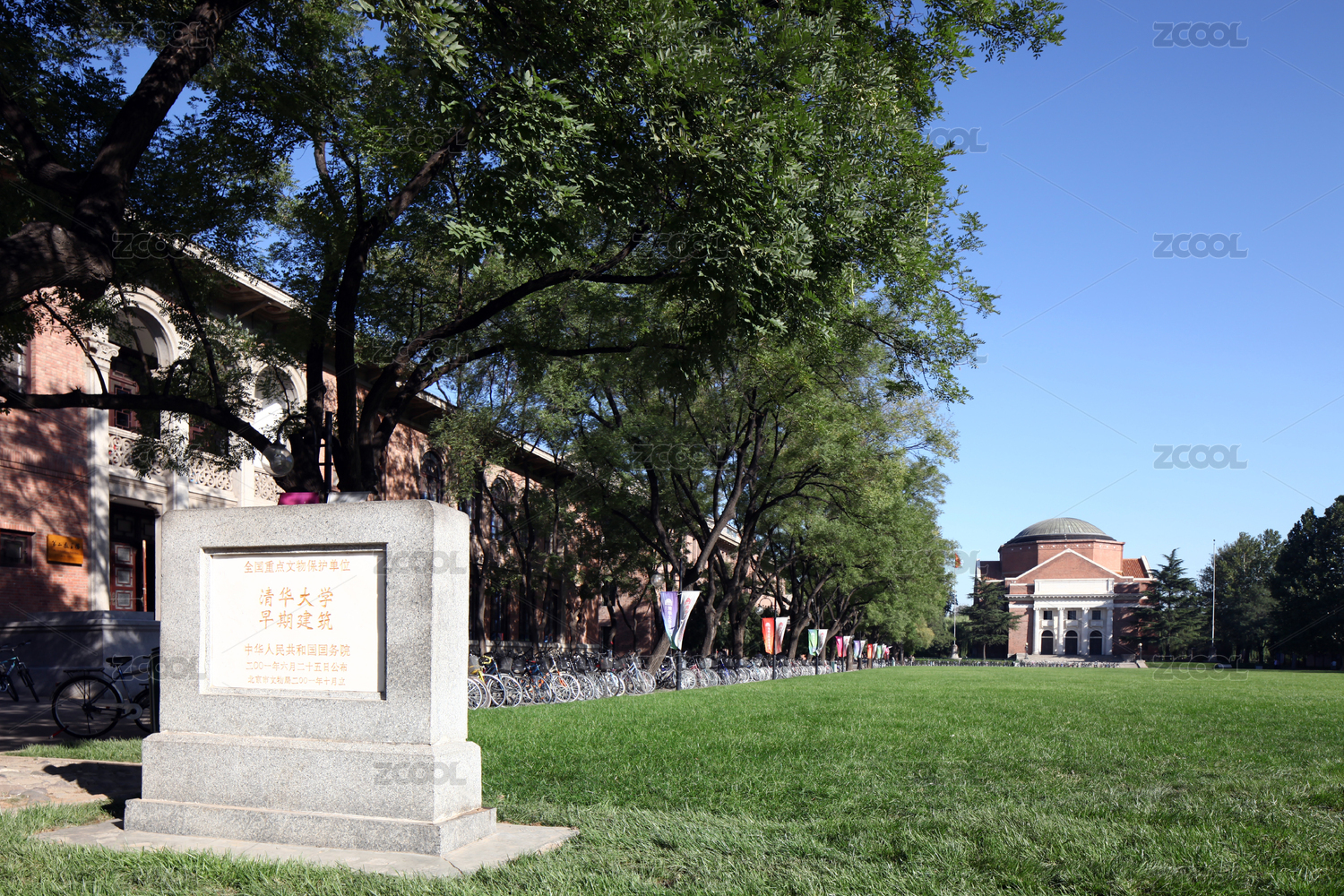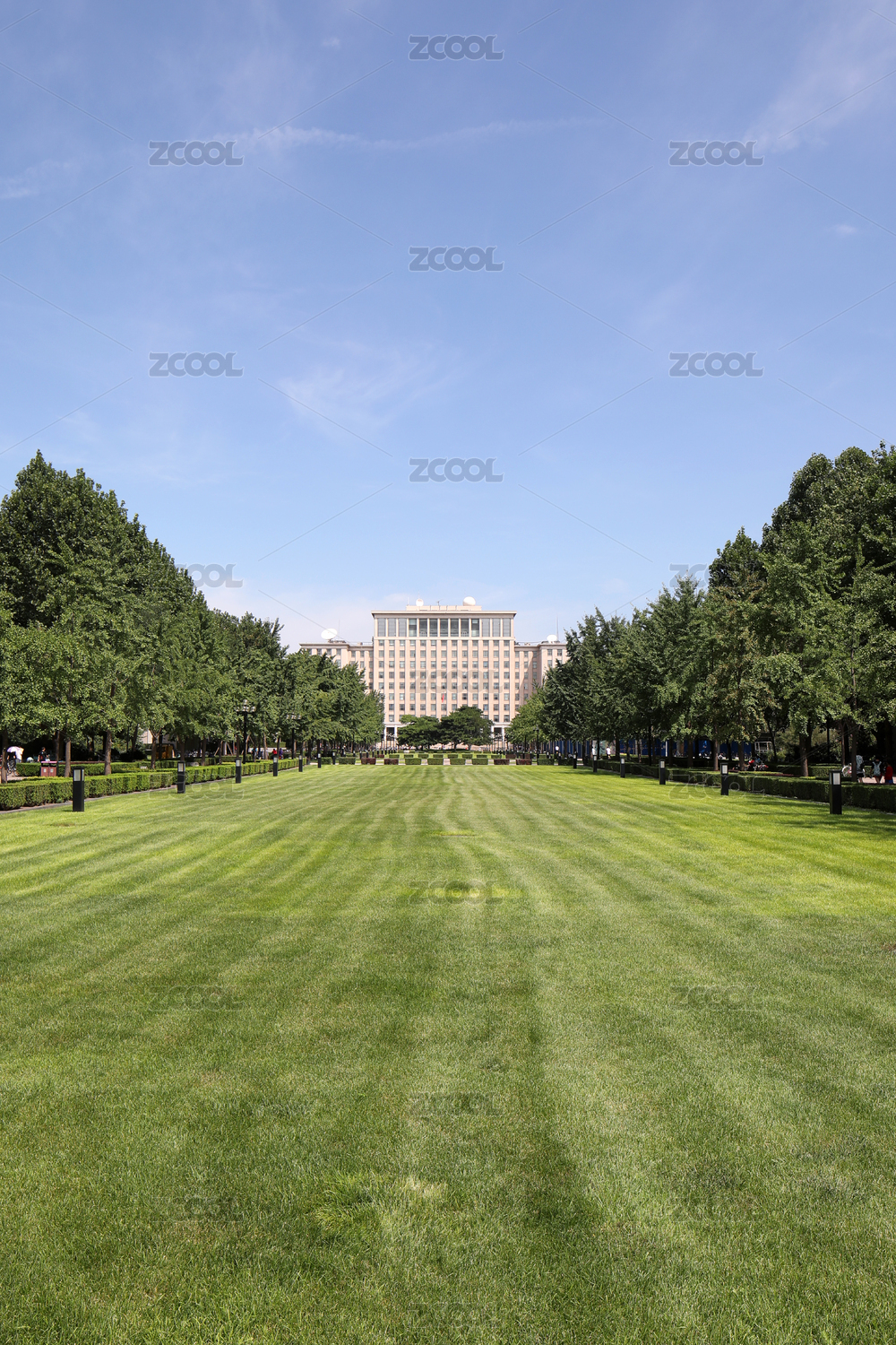 夏天的藍天下,北京清華大學大禮堂和綠草坪