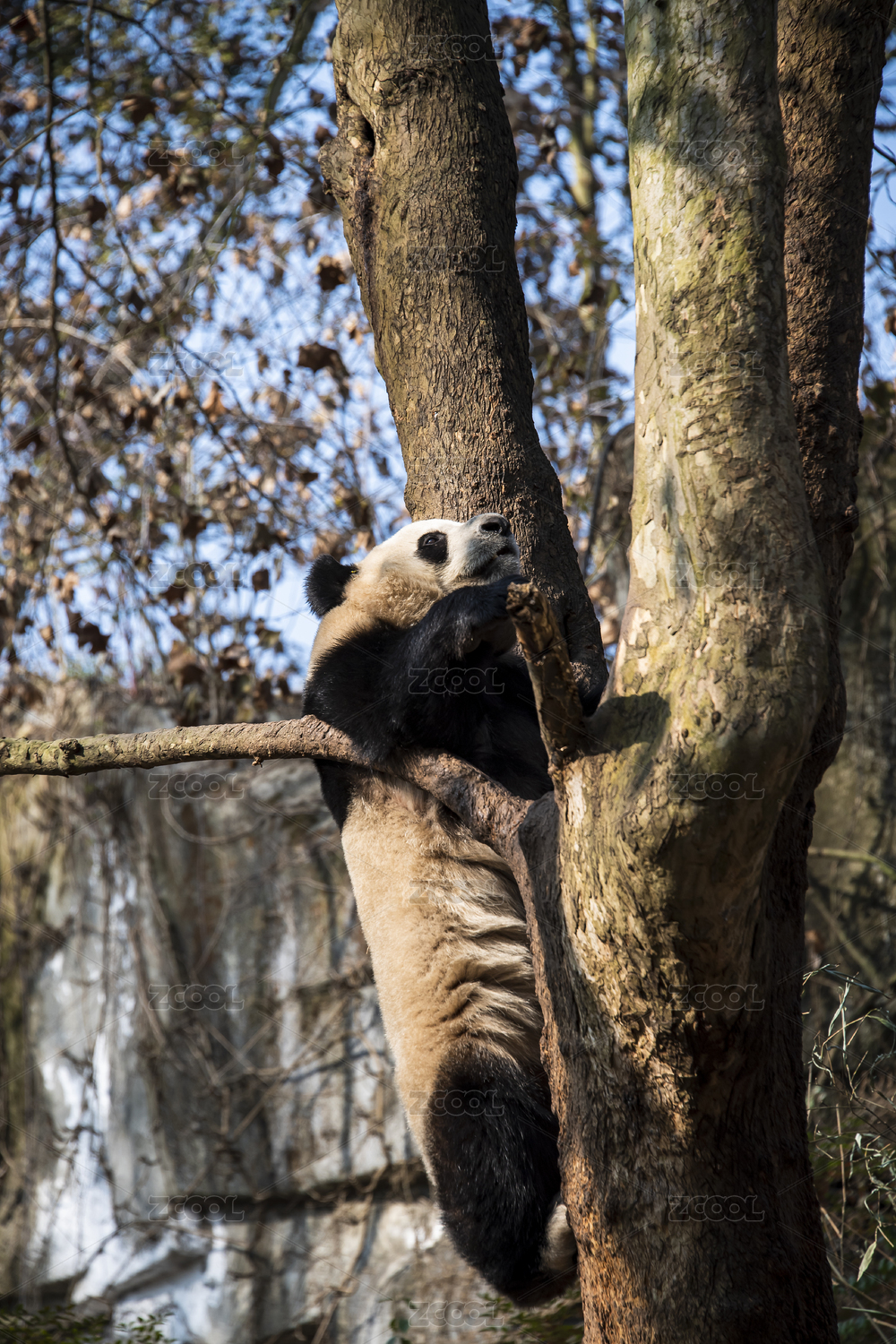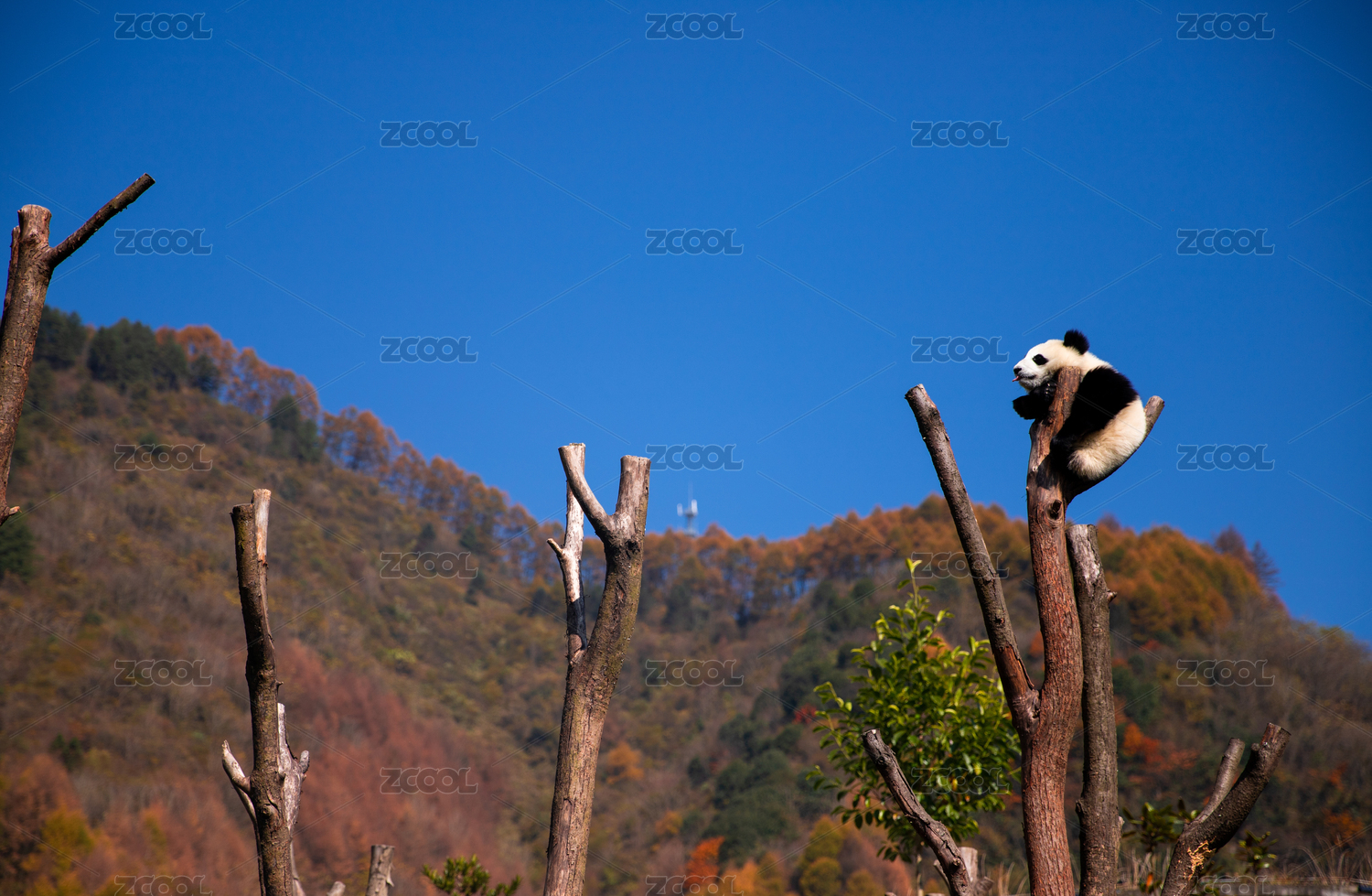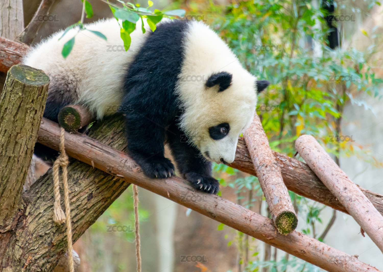 一只可愛(ài)的小熊貓正在攀爬樹干