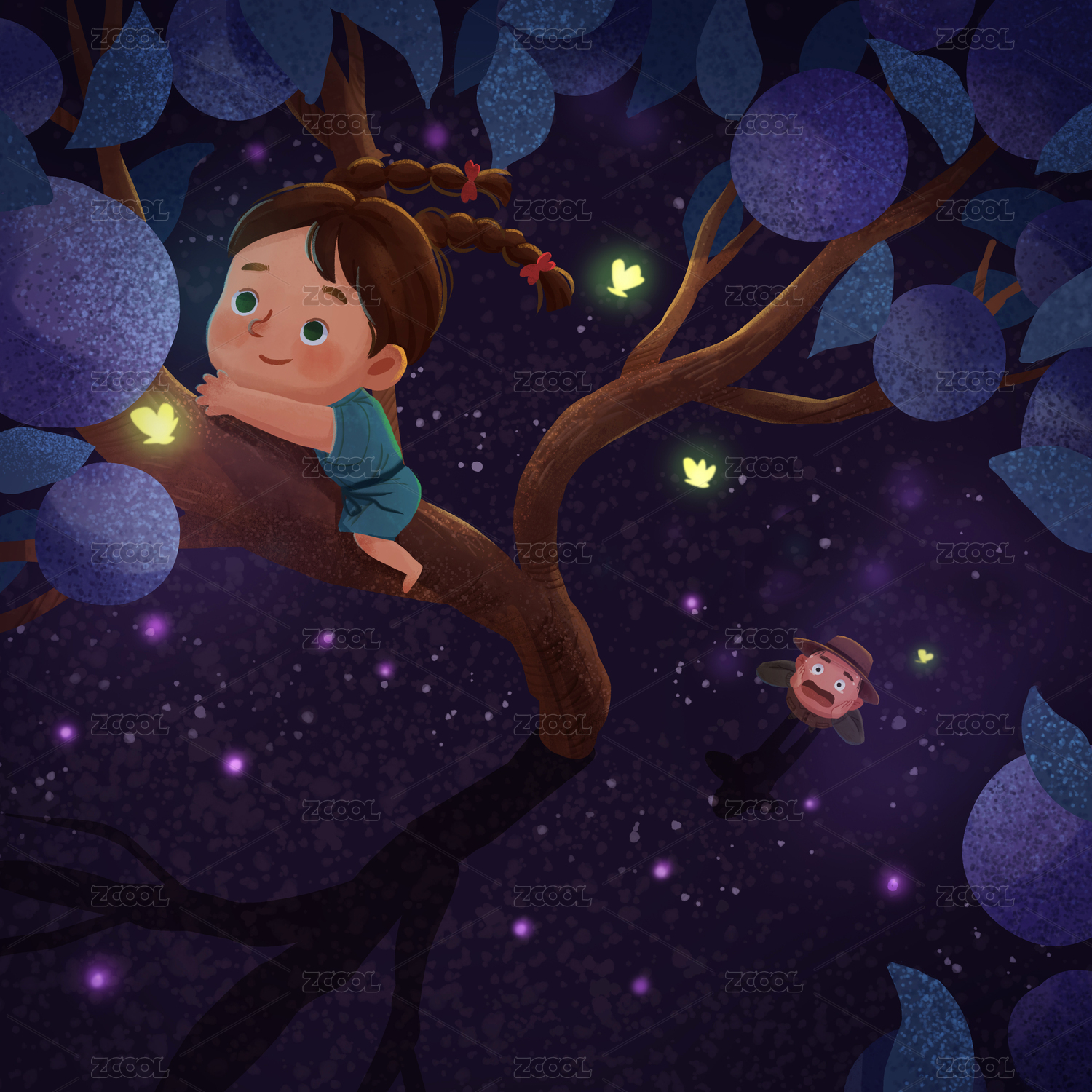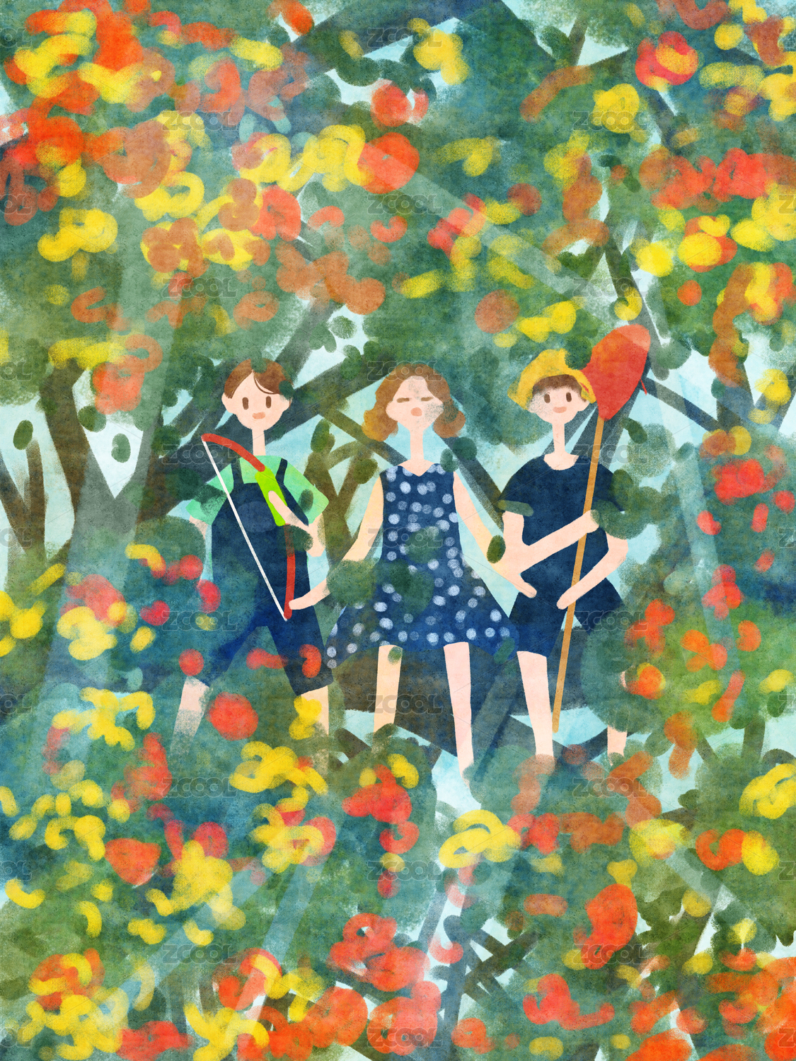 霜降摘柿子少女和兩個(gè)小男孩玩耍節(jié)氣國(guó)風(fēng)插畫