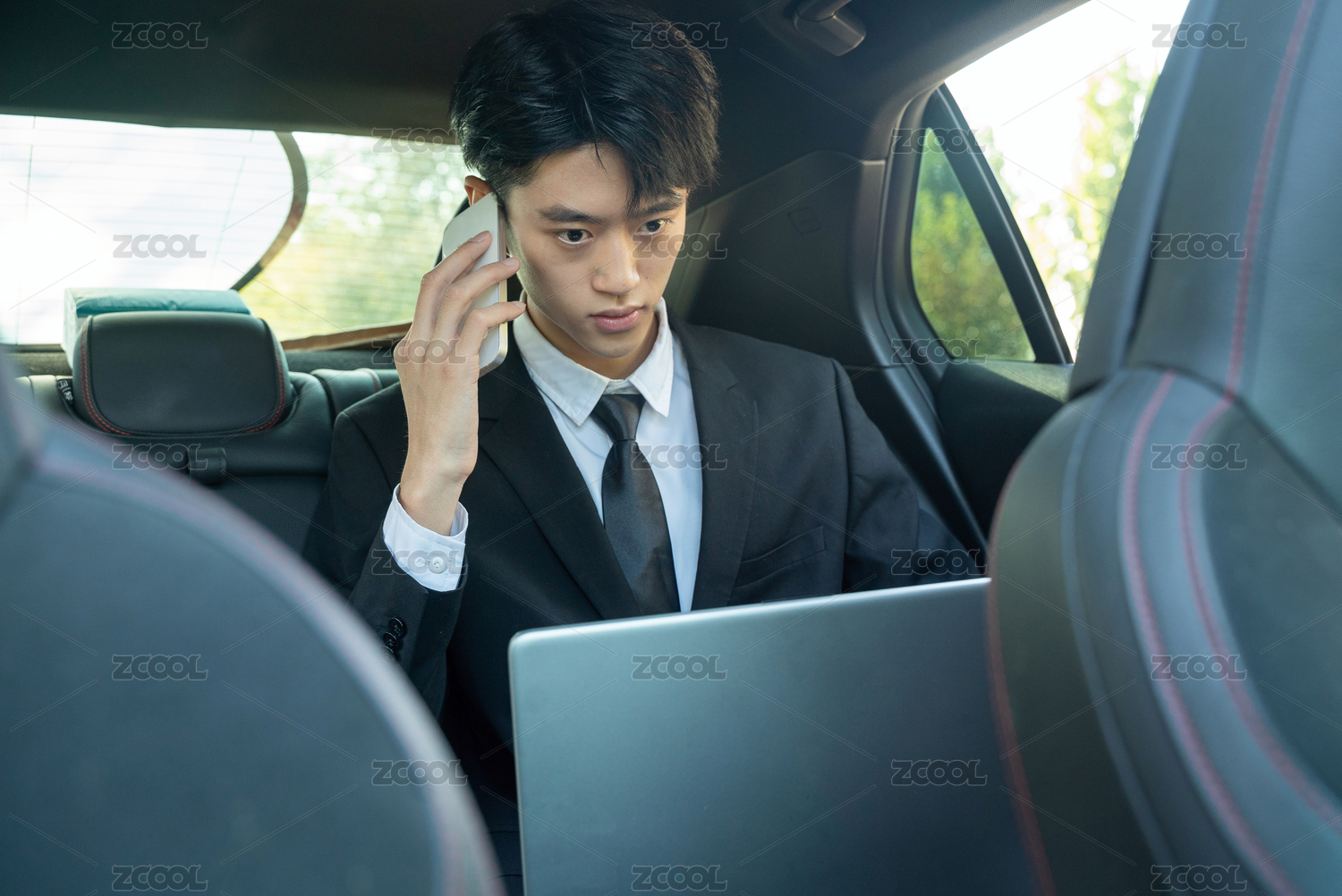 汽車后座的商務(wù)男性使用手機(jī)通話