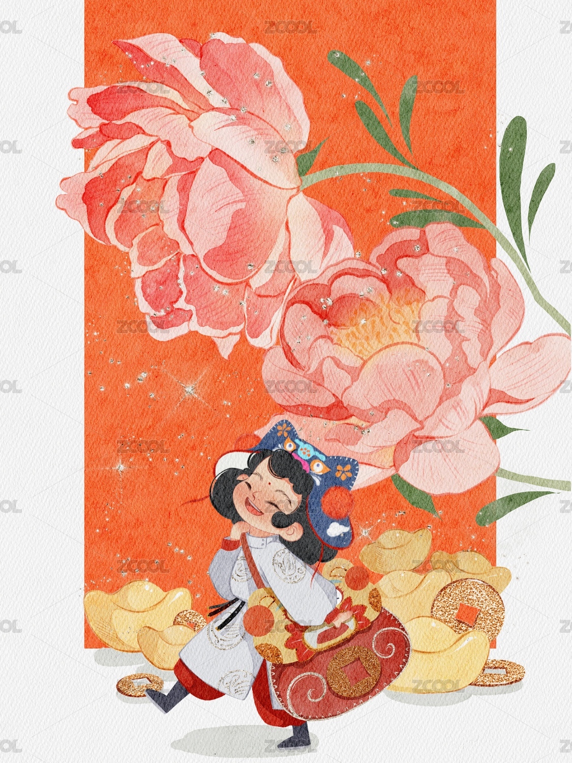 巨大的金元寶,一個可愛的小財神手拿著招財