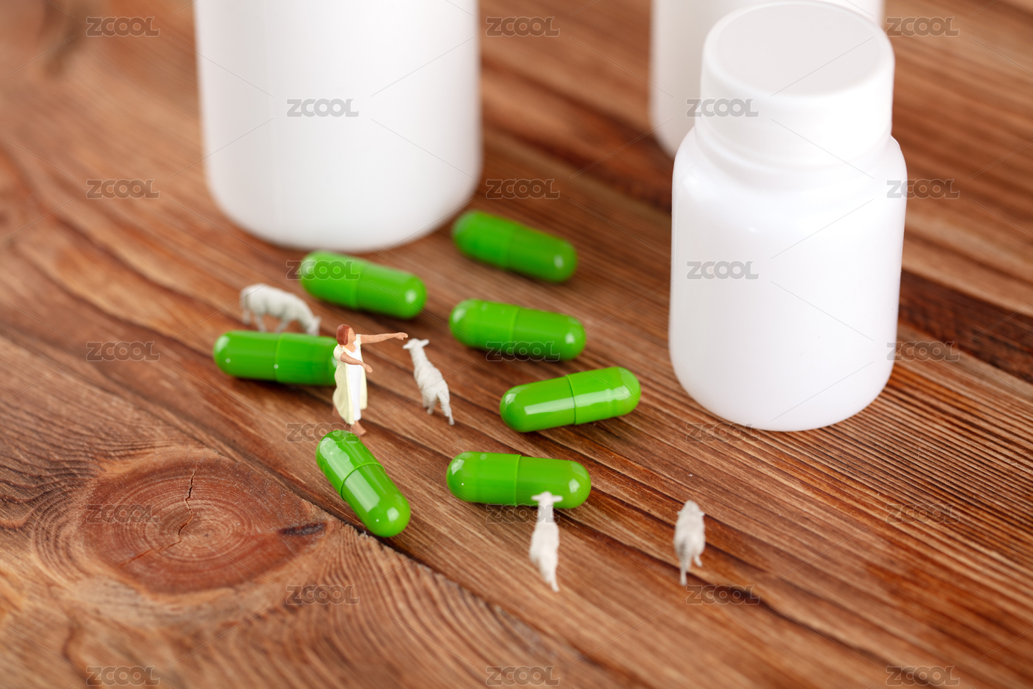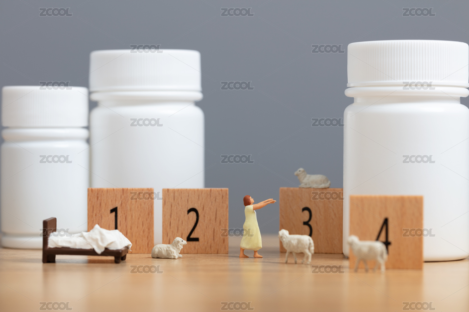 微縮創(chuàng)意失眠夢游的女性數(shù)羊與褪黑素藥瓶