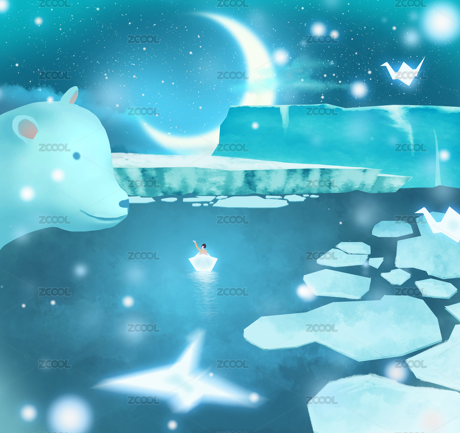 一個女孩坐紙船夢游北極與北極熊打招呼