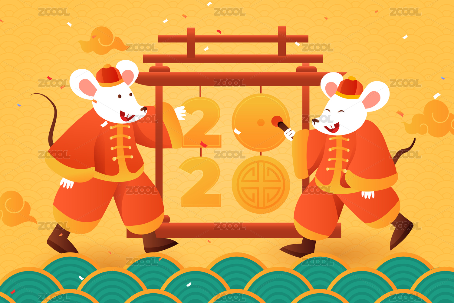 卡通2020鼠年藝術(shù)字敲鑼打鼓中國(guó)風(fēng)背景矢量插畫