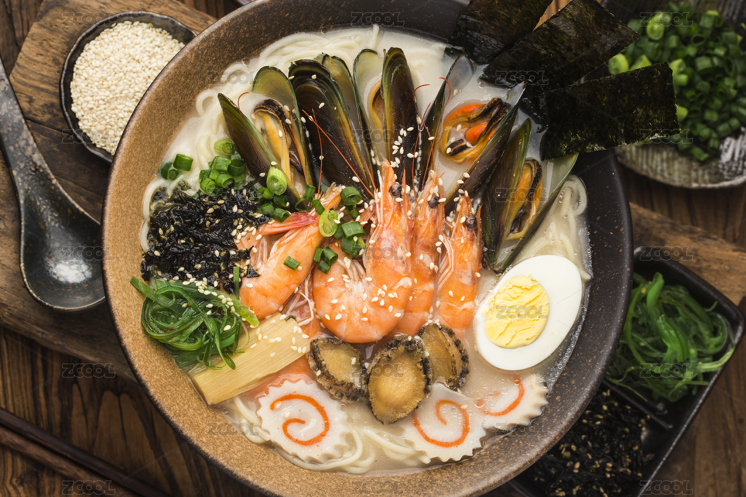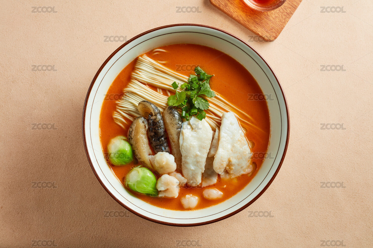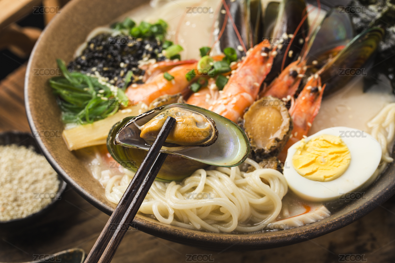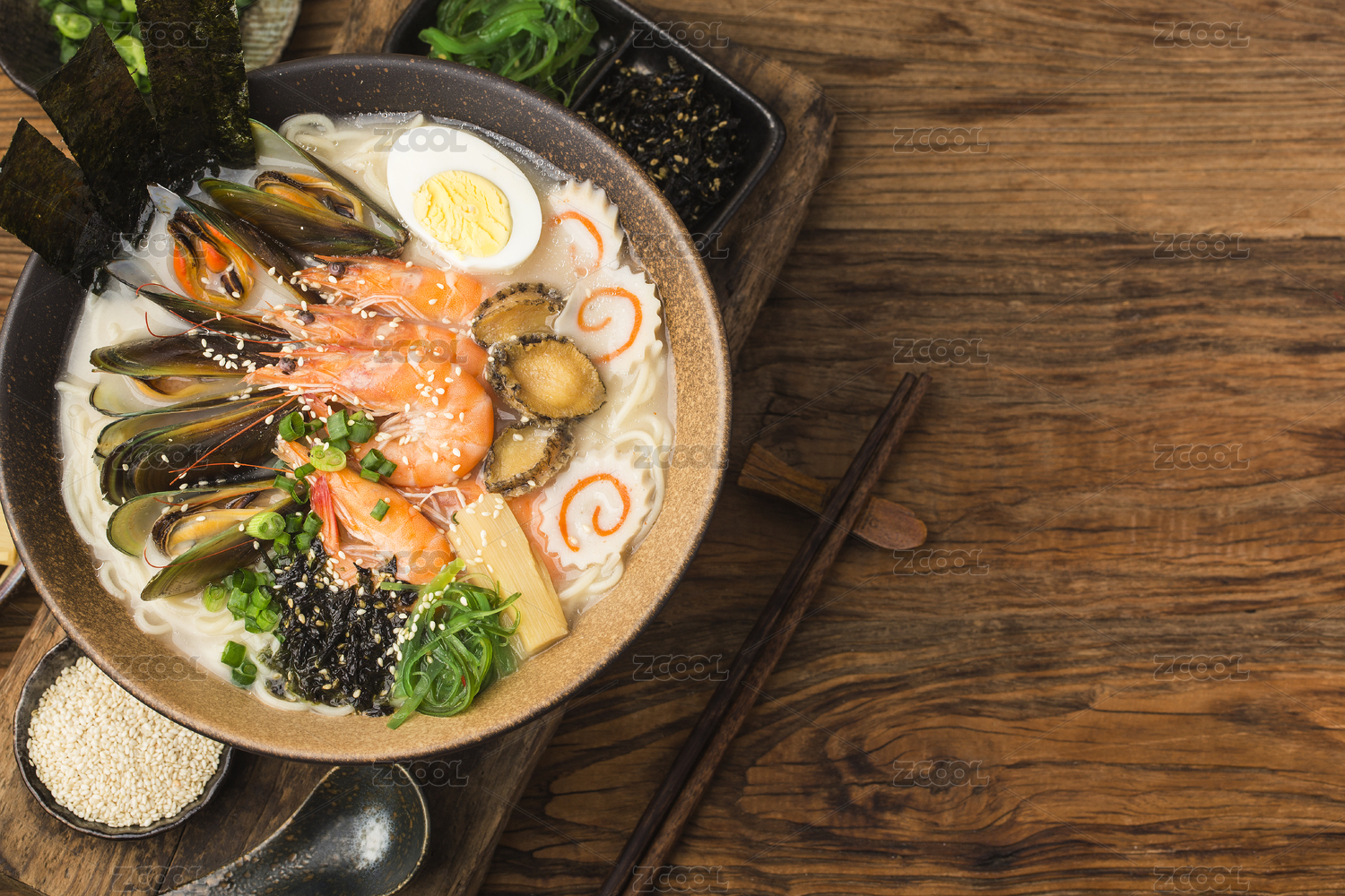 木質(zhì)托盤里的一碗和牛海鮮拉面
