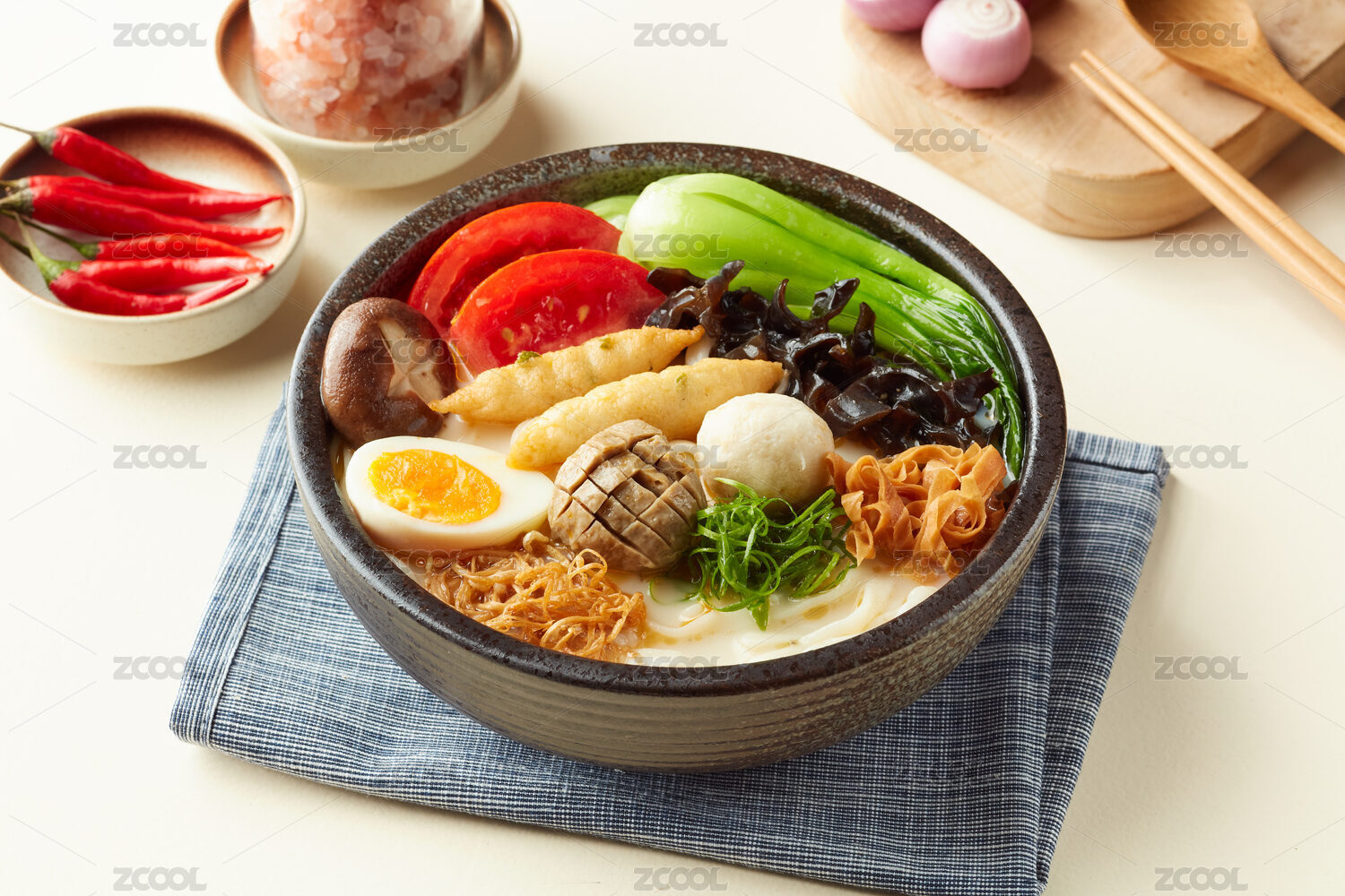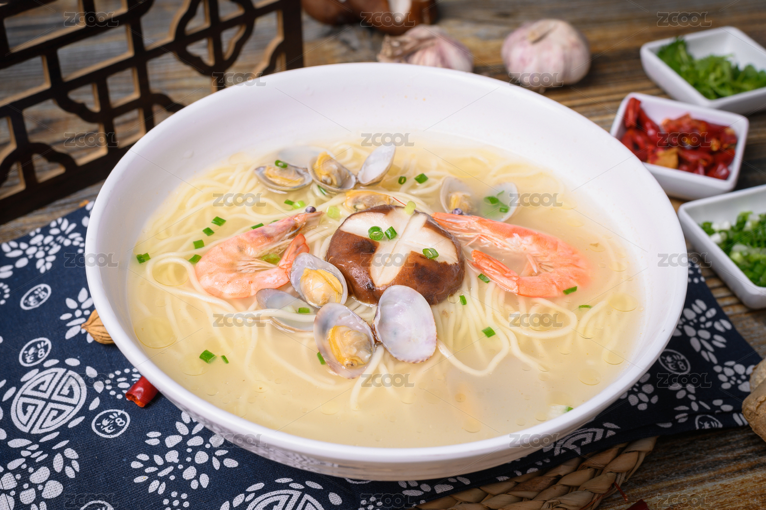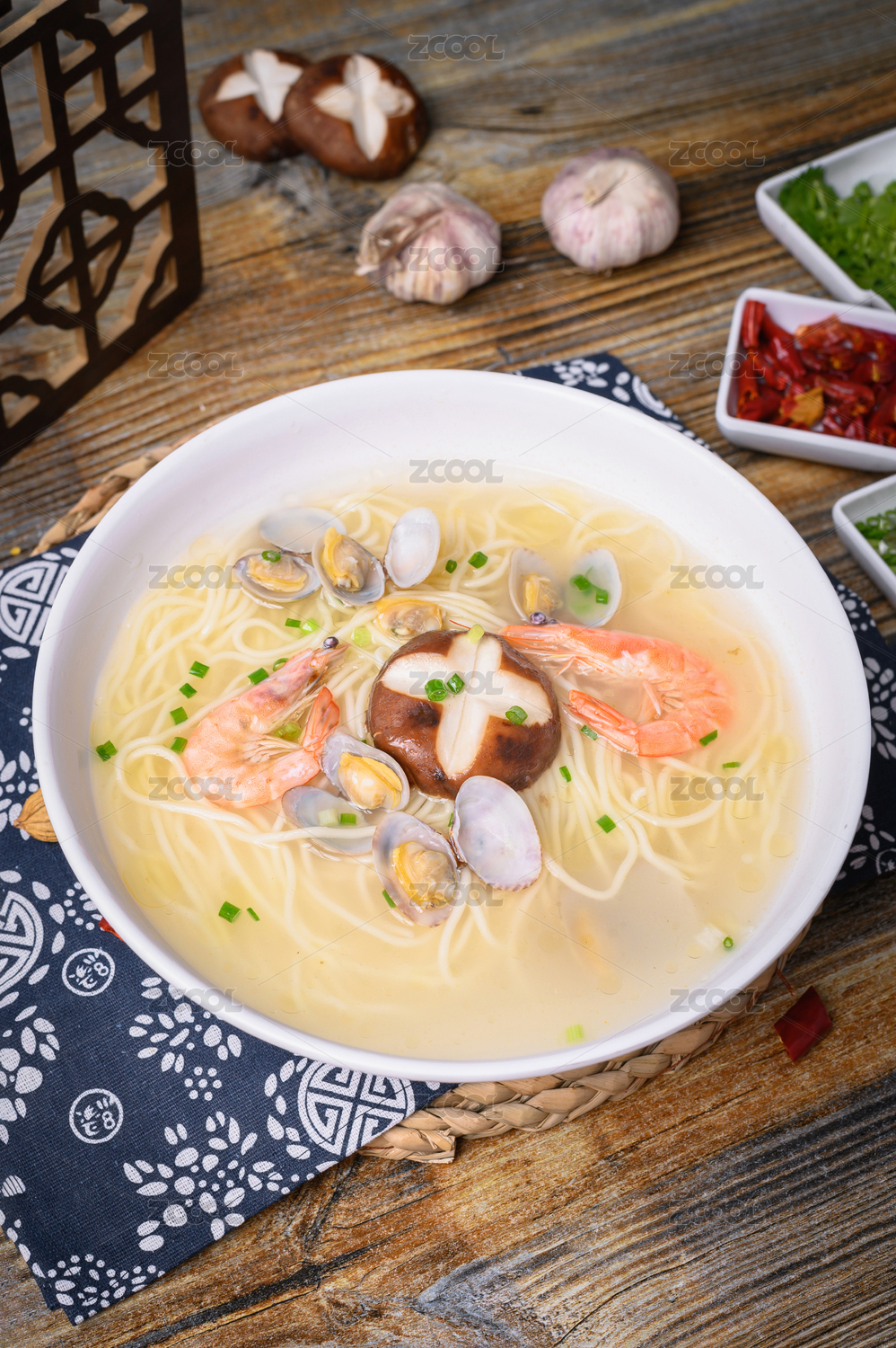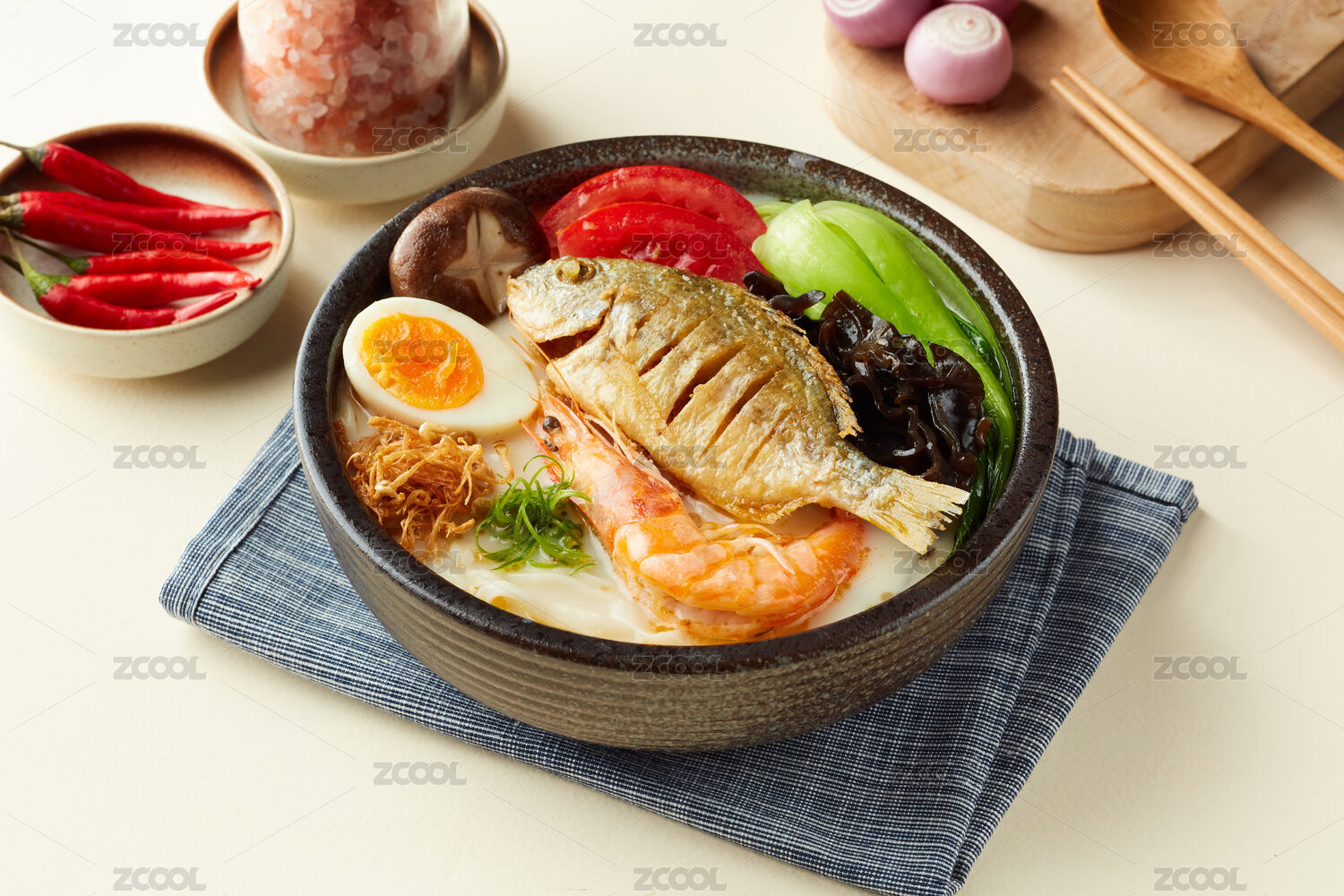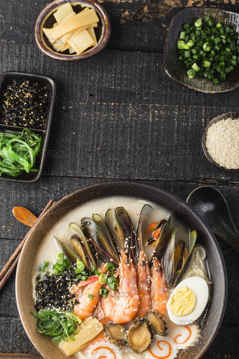 木質(zhì)托盤里的一碗和牛海鮮拉面