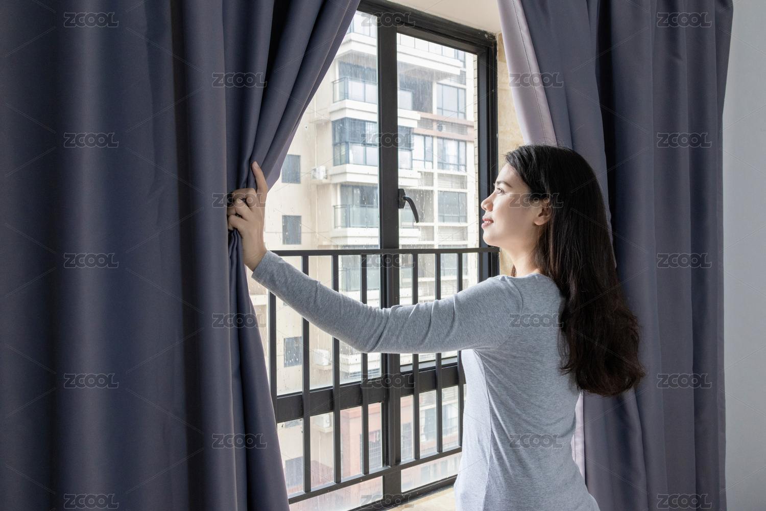 中國(guó)年輕女生在臥室拉開(kāi)窗簾