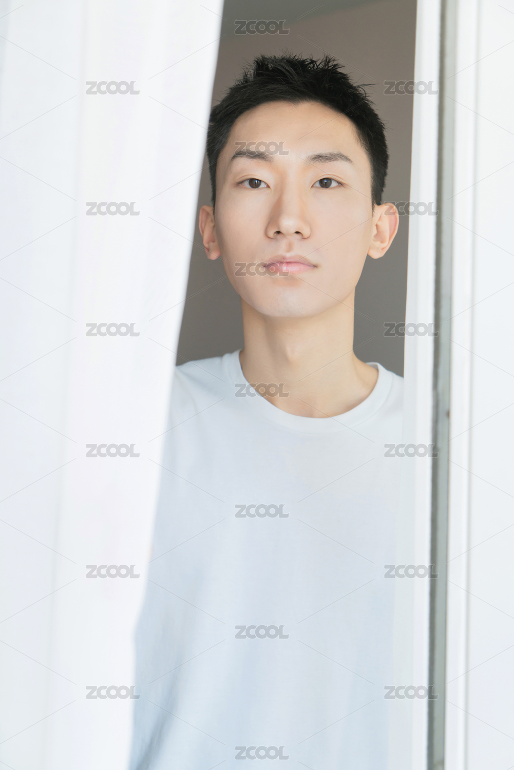 中國(guó)男人在臥室剛起床拉開(kāi)窗簾