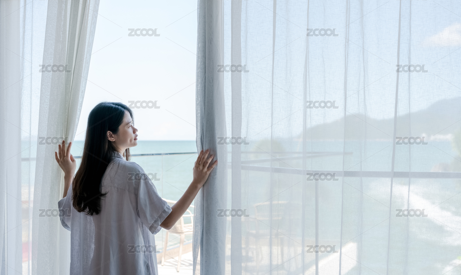 女人站在窗邊手拉開(kāi)窗簾,她看著窗外的海景