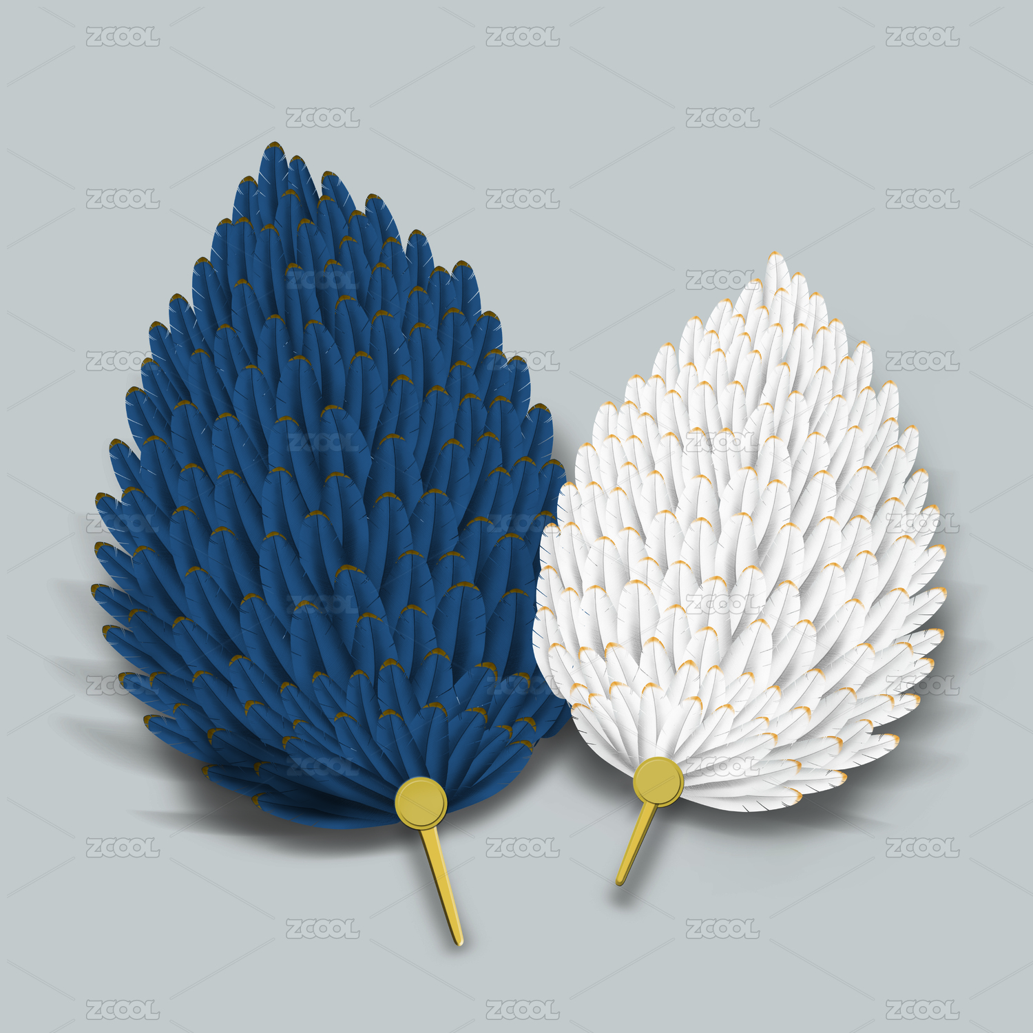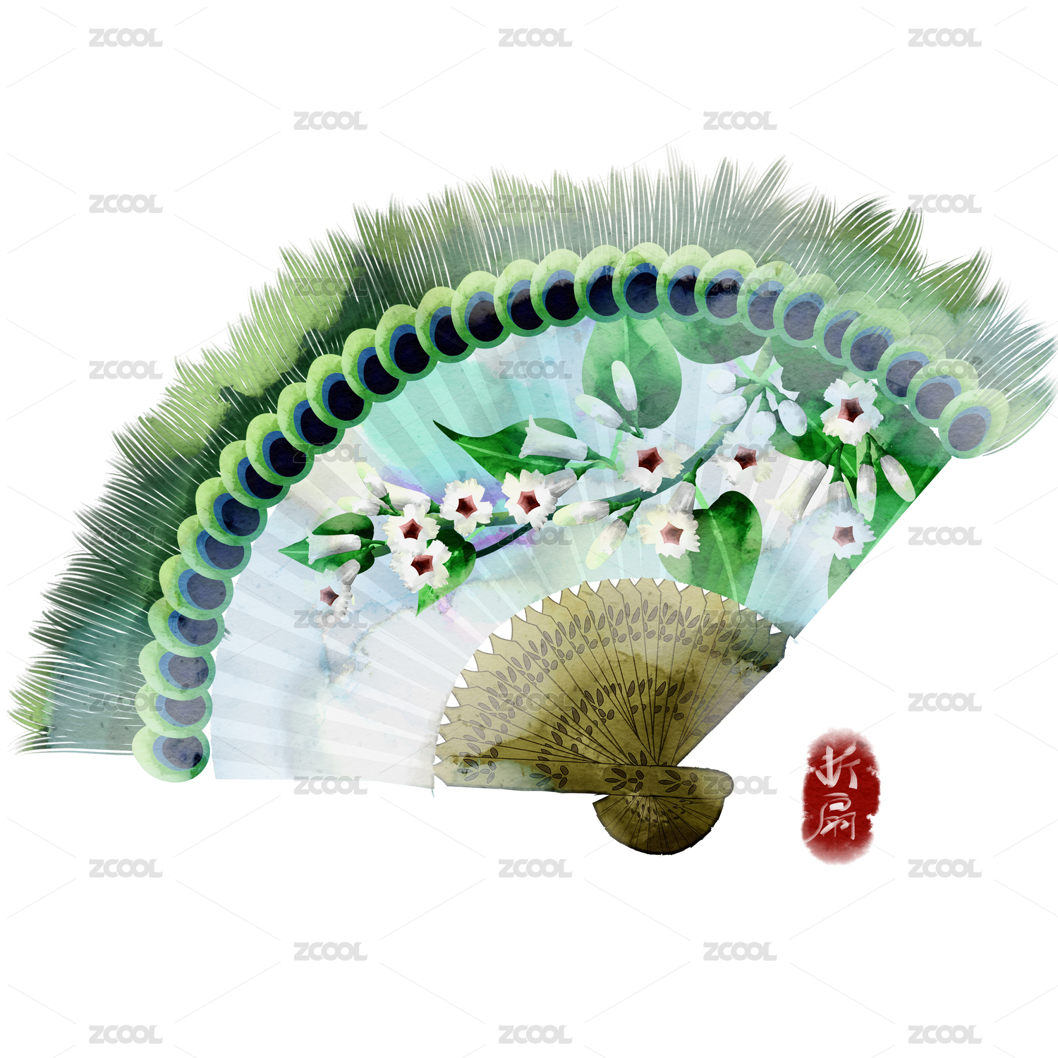 水彩風(fēng)格中國古代孔雀羽毛扇子插畫元素