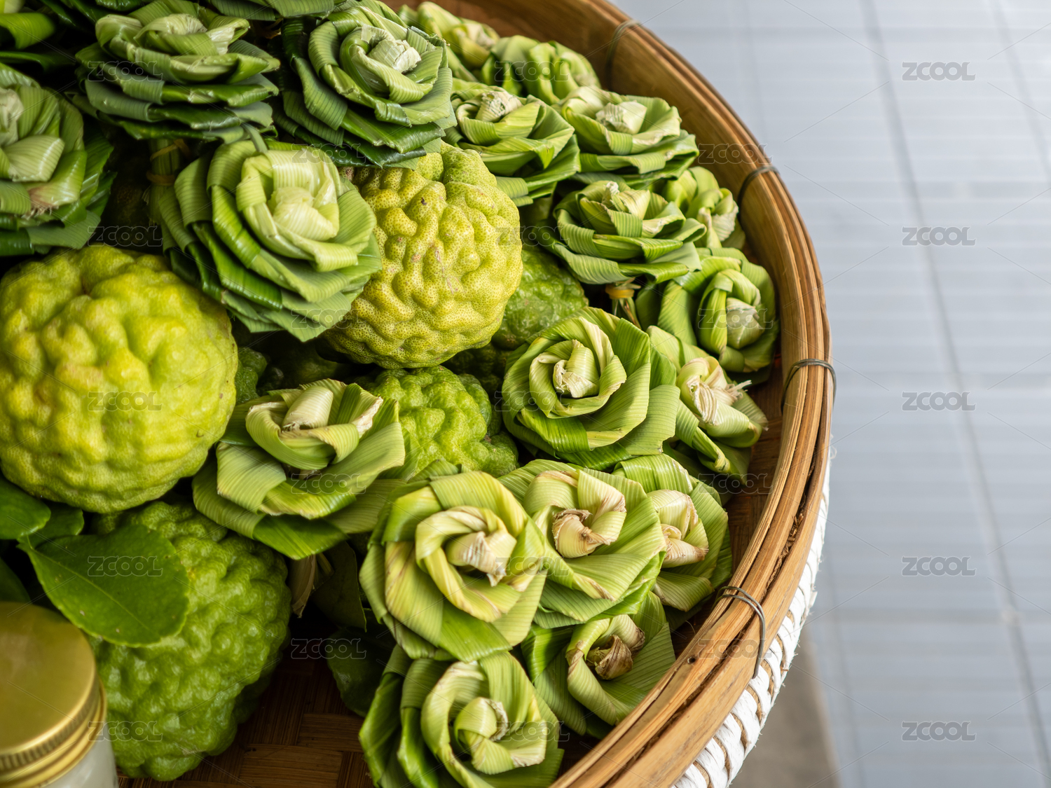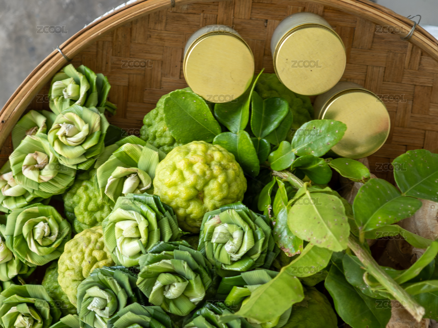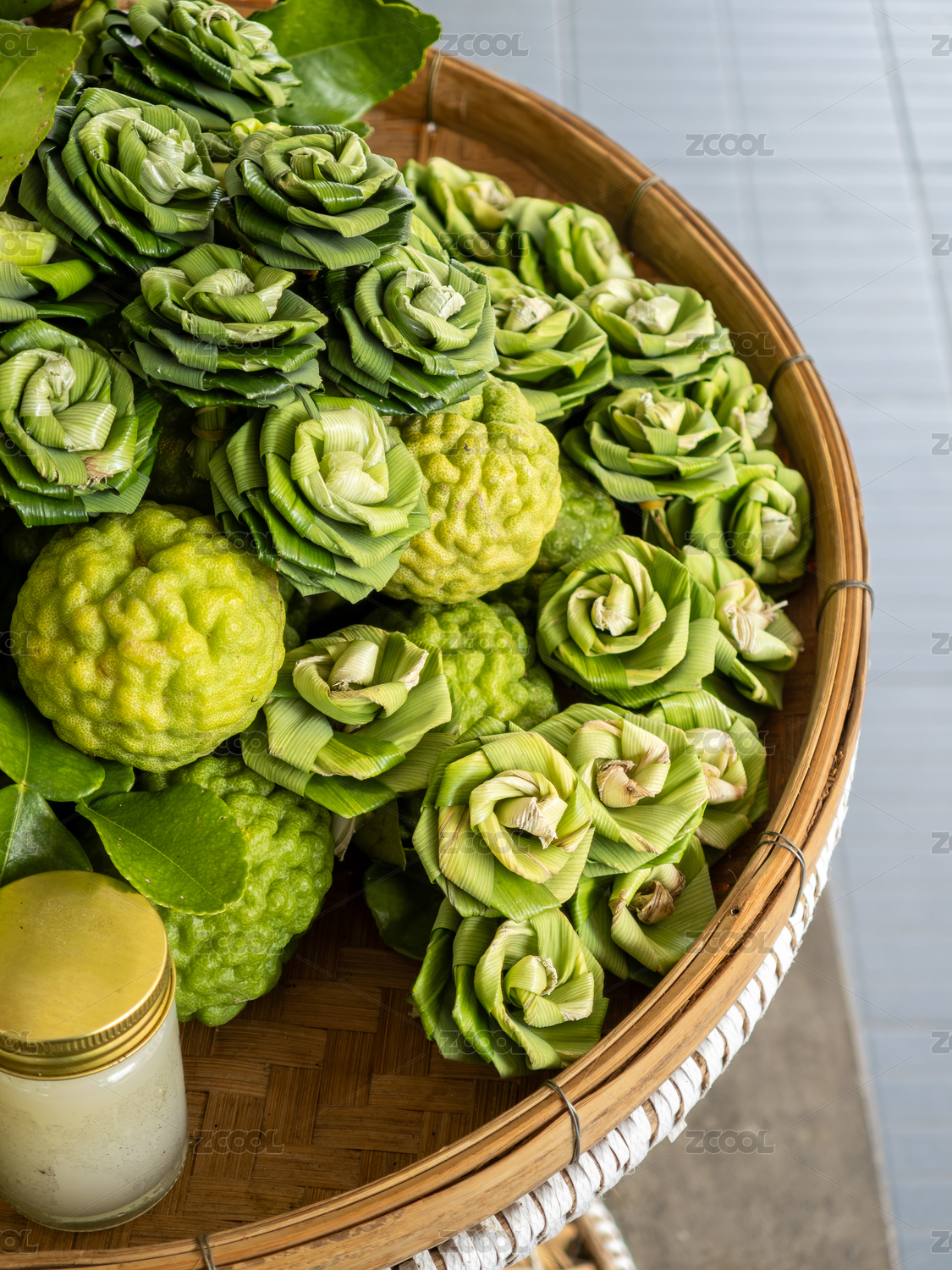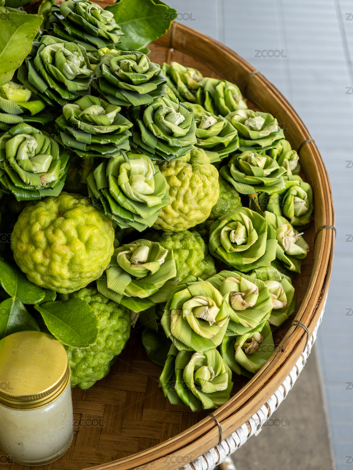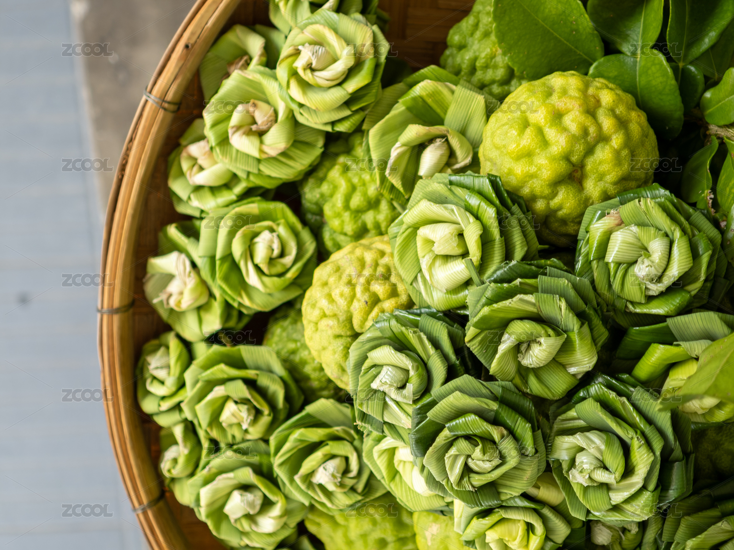 竹籃里的新鮮箭葉橙和香蘭葉做的手工玫瑰