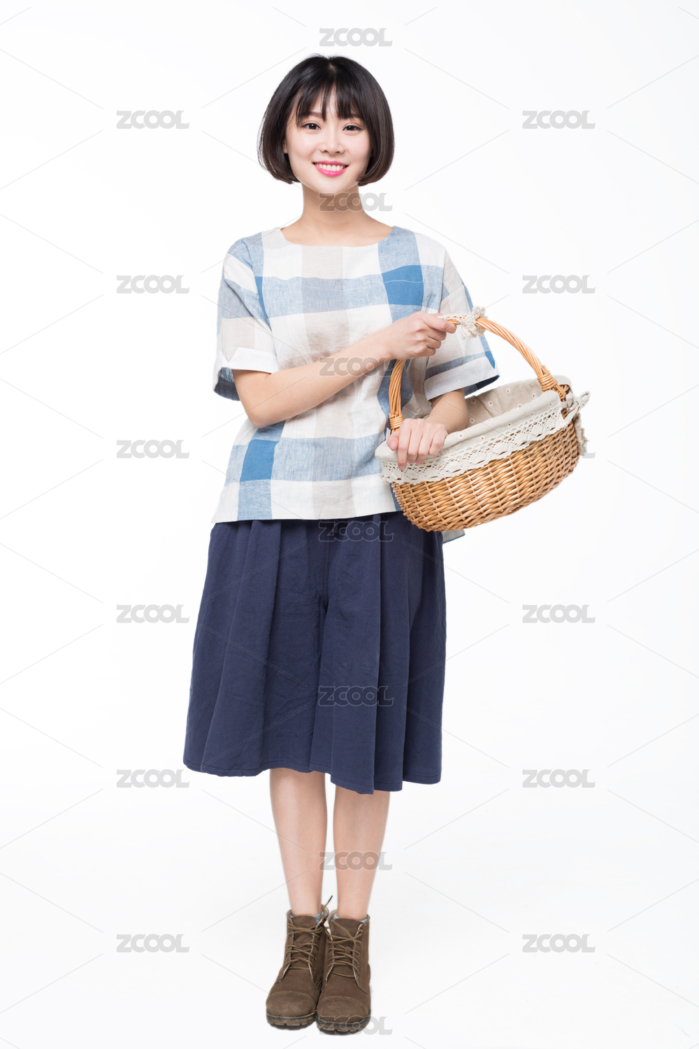白色背景,提著竹籃的年輕漂亮女子的形象