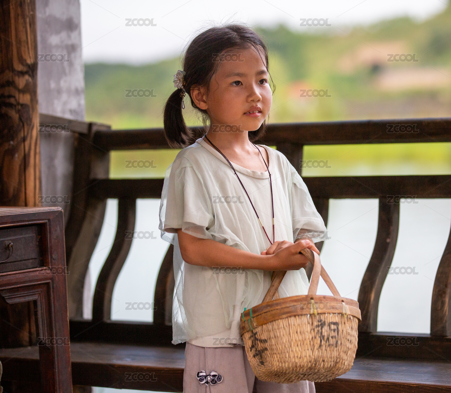 小女孩手提竹籃站立