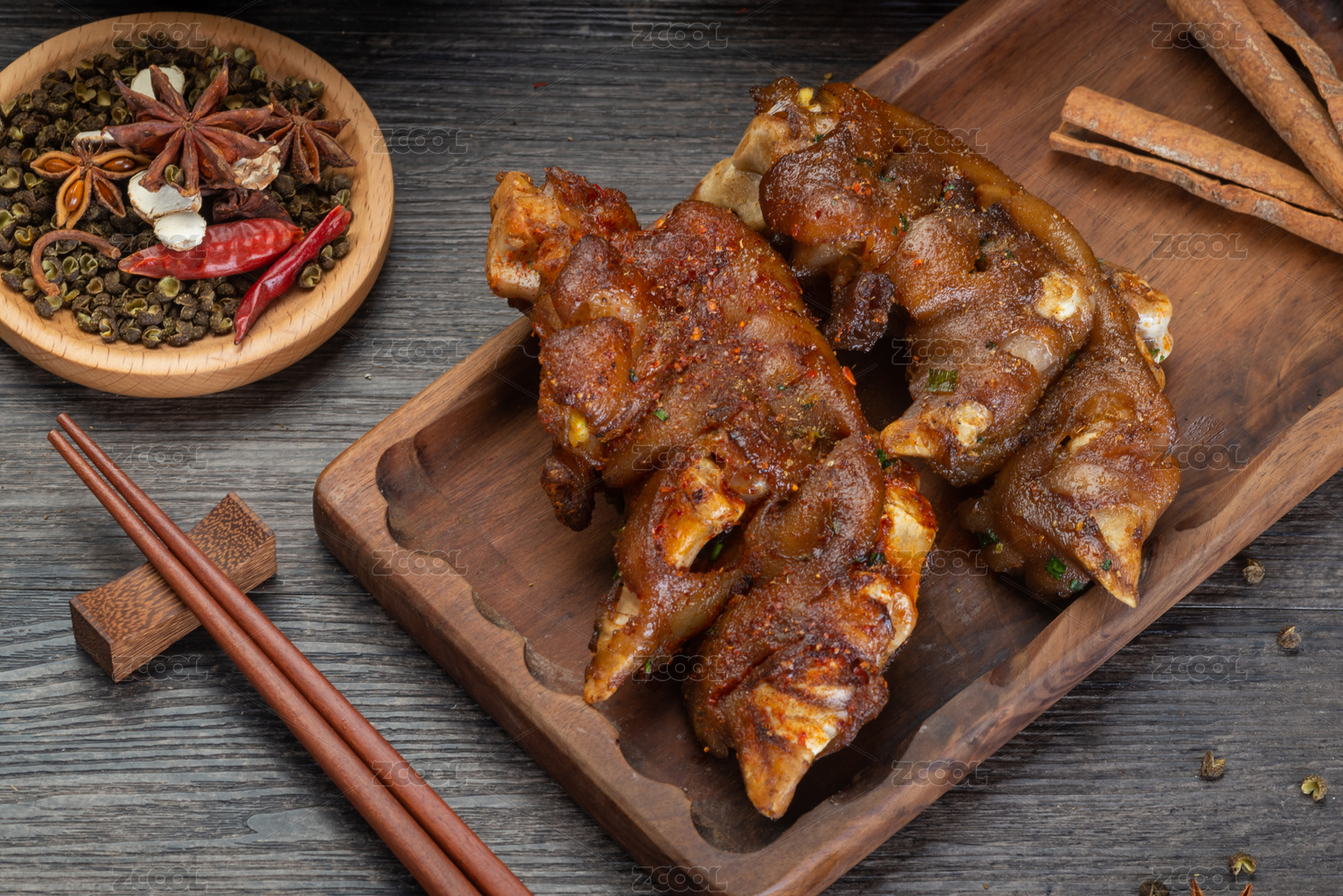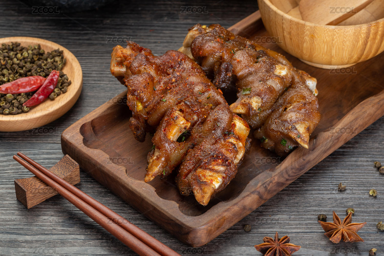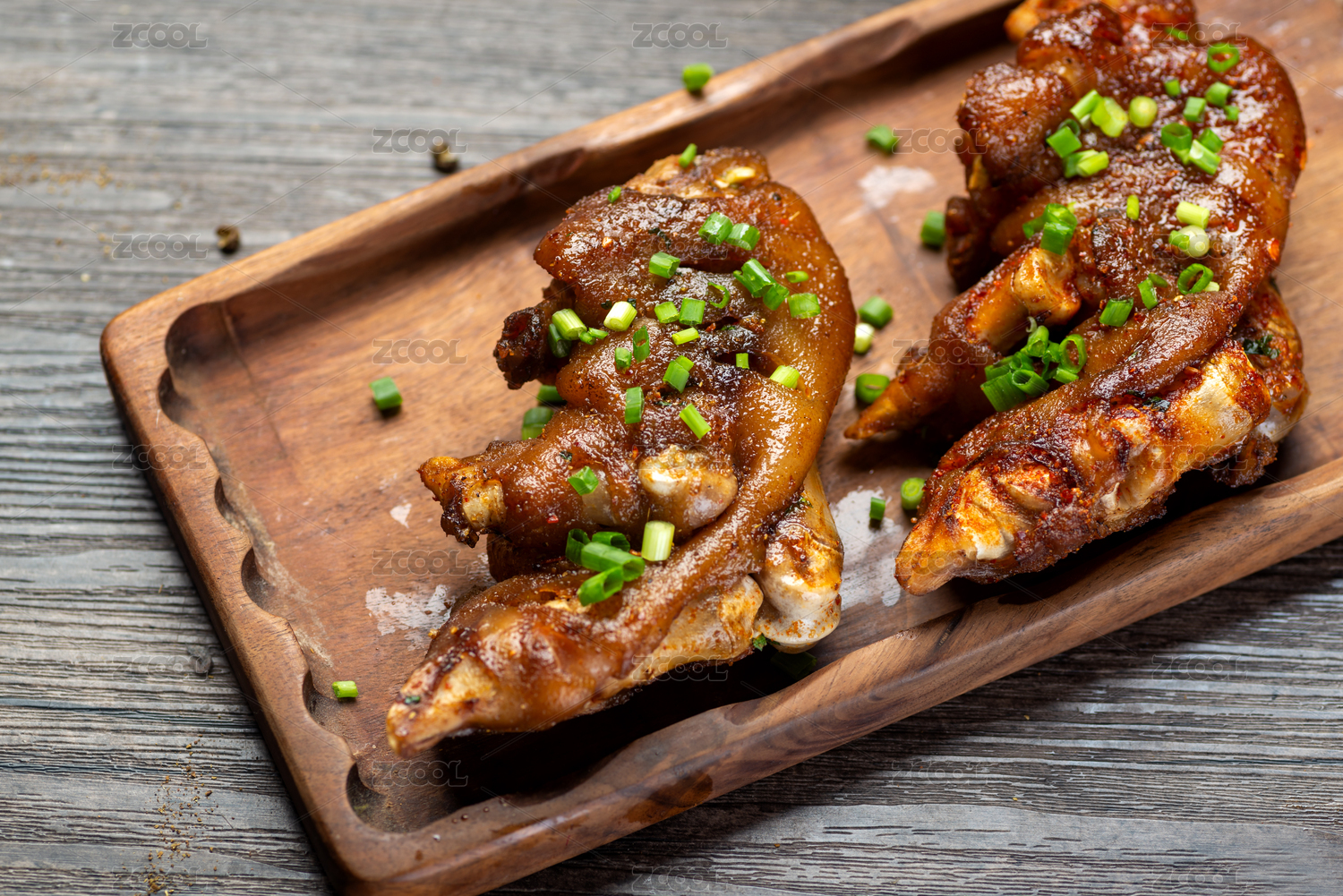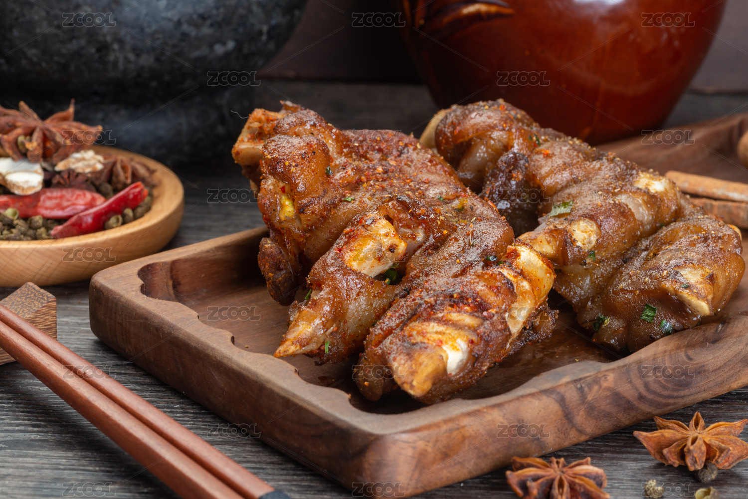 放在木質(zhì)盤子上的香辣烤豬蹄