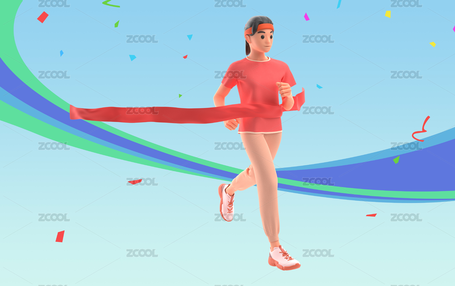穿紅色T恤的3D跑步女青年沖破紅色終點(diǎn)線