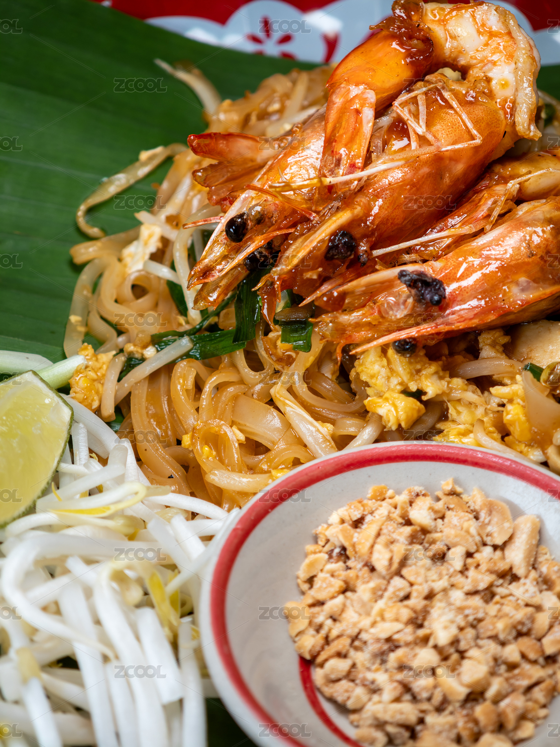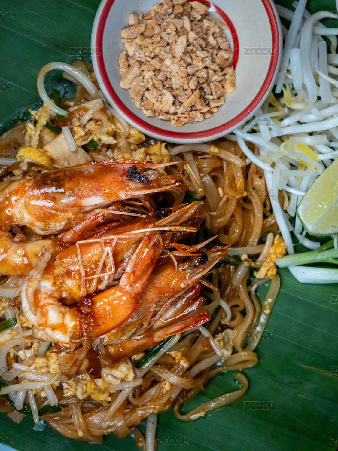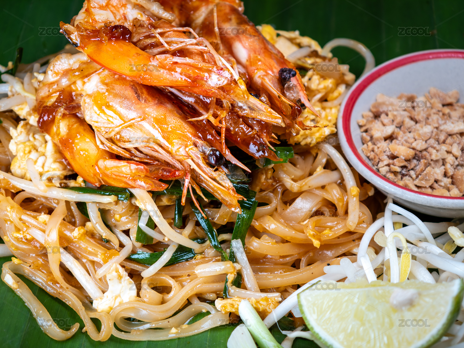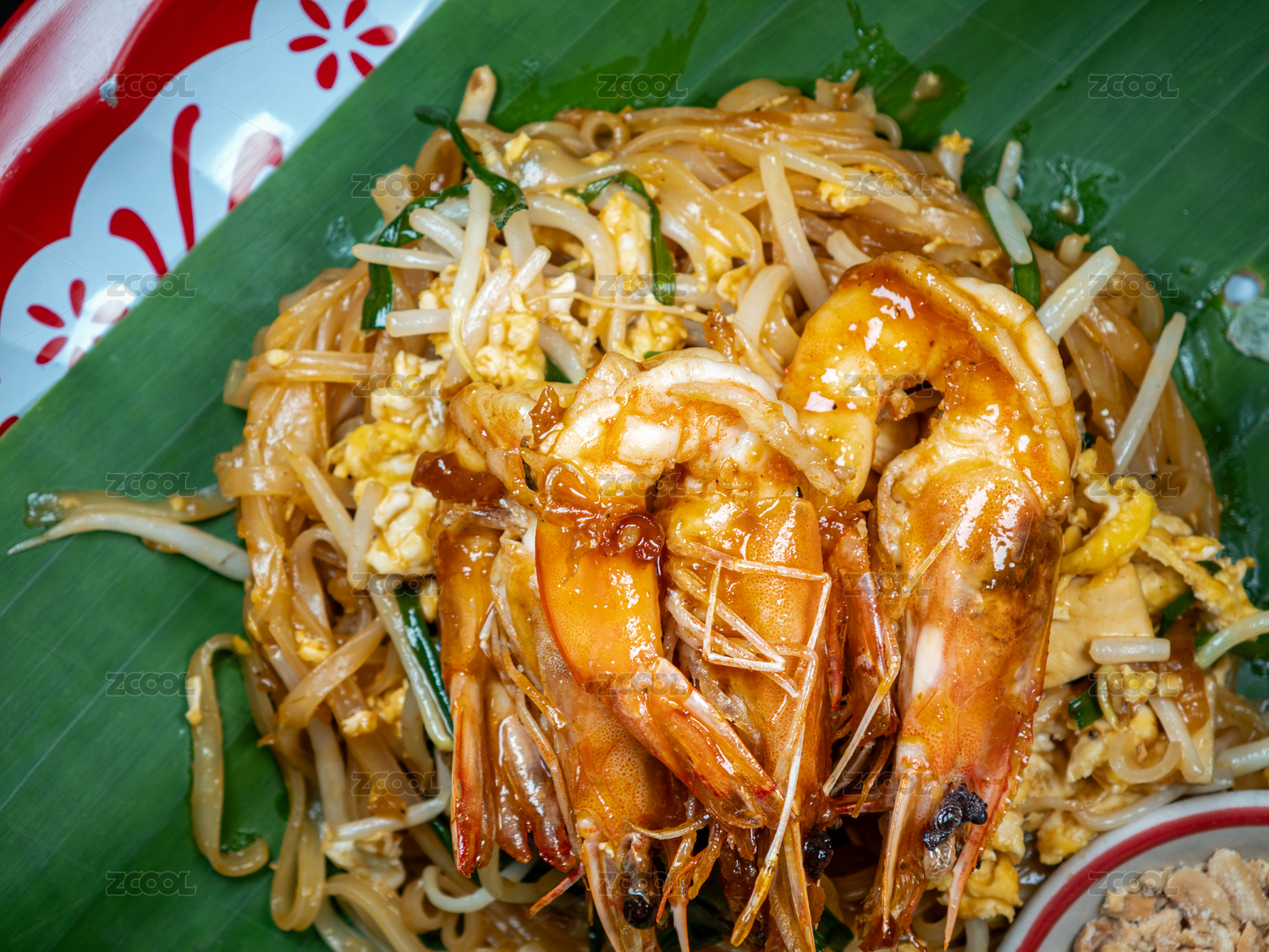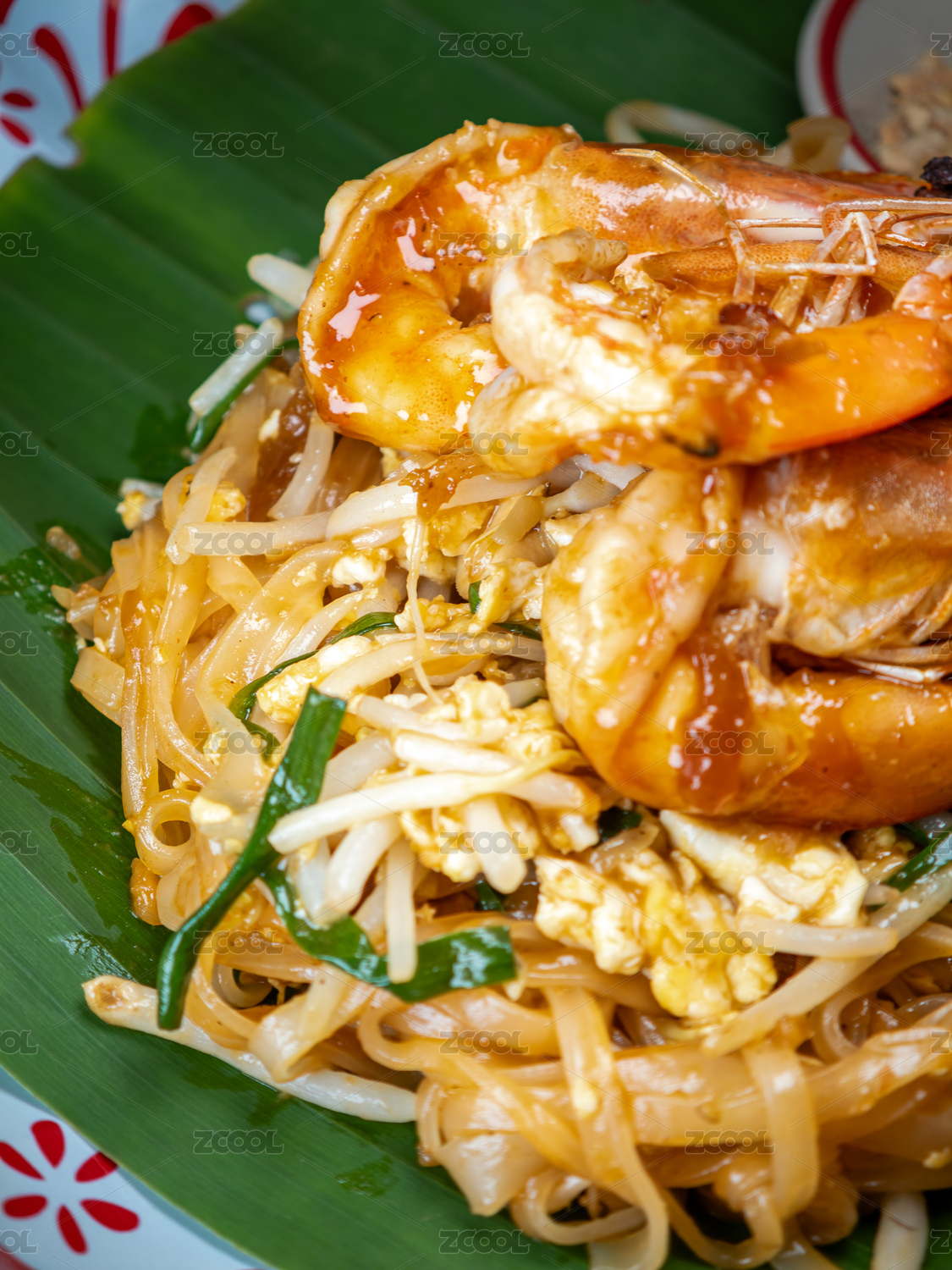 盛放在香蕉葉上的泰式大蝦炒河粉