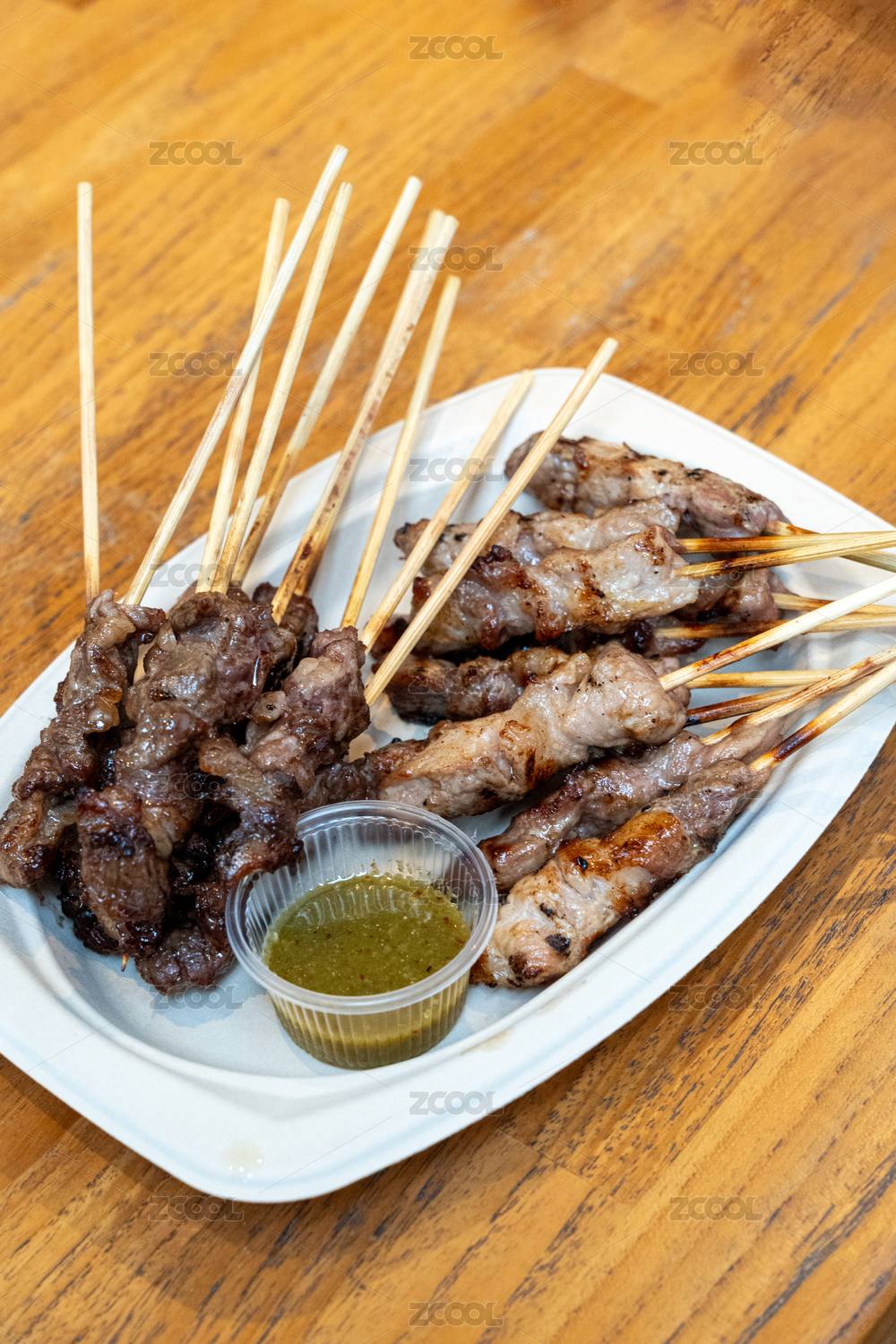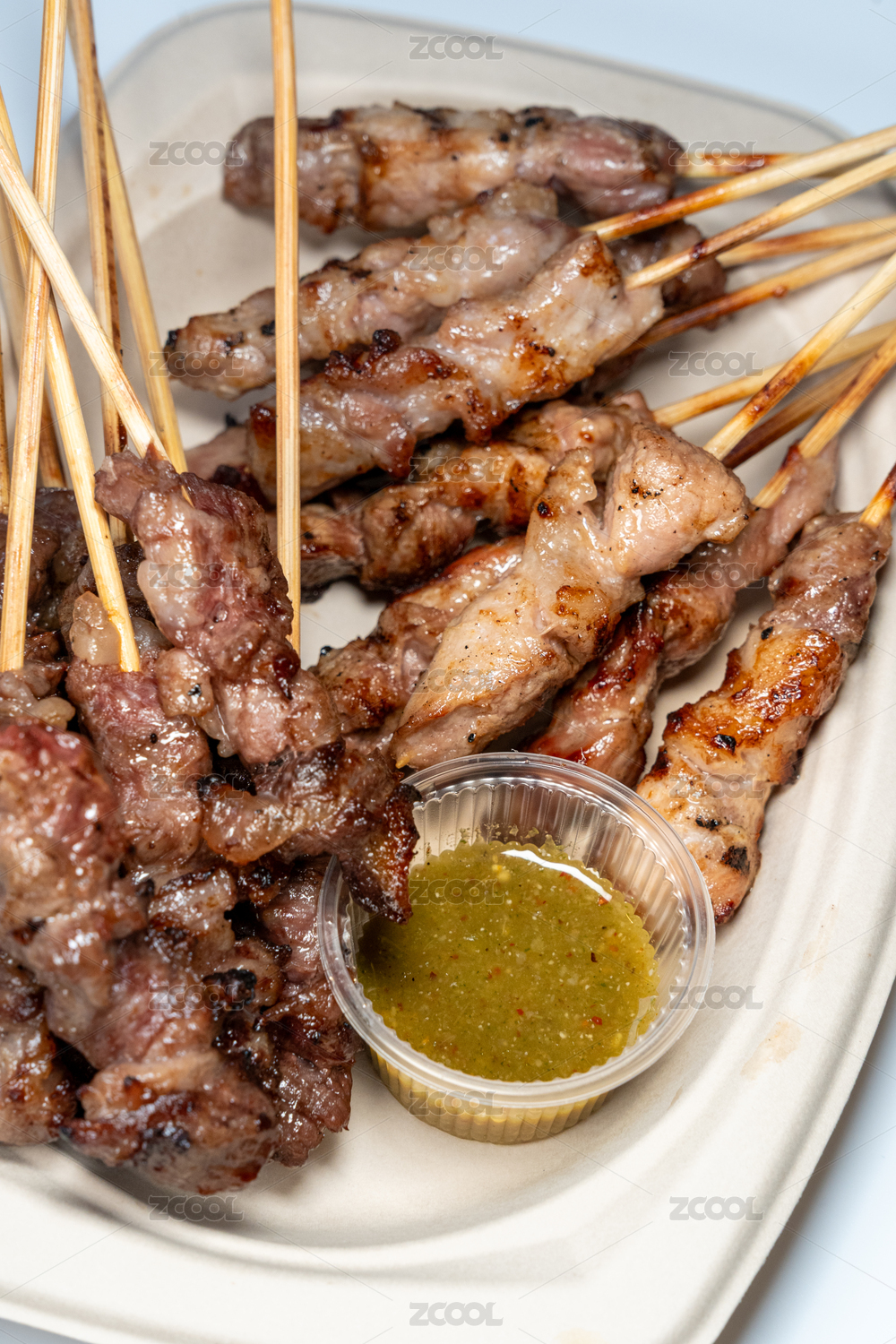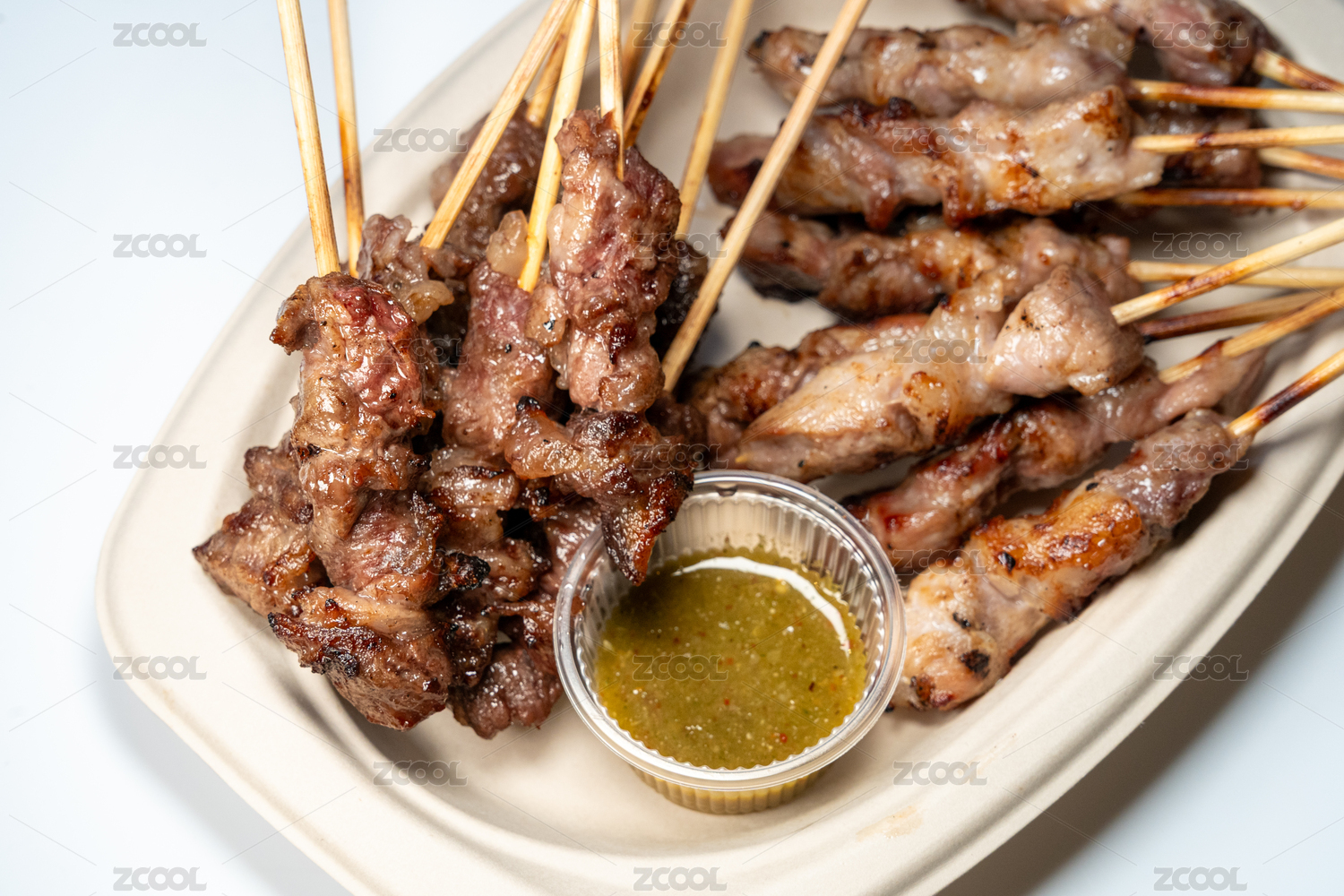 配有特色辛辣蘸醬的泰式烤豬肉串和烤牛肉串