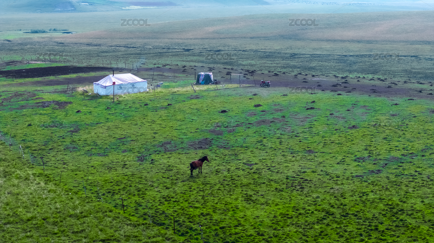 草原牧場牧民帳篷一匹馬
