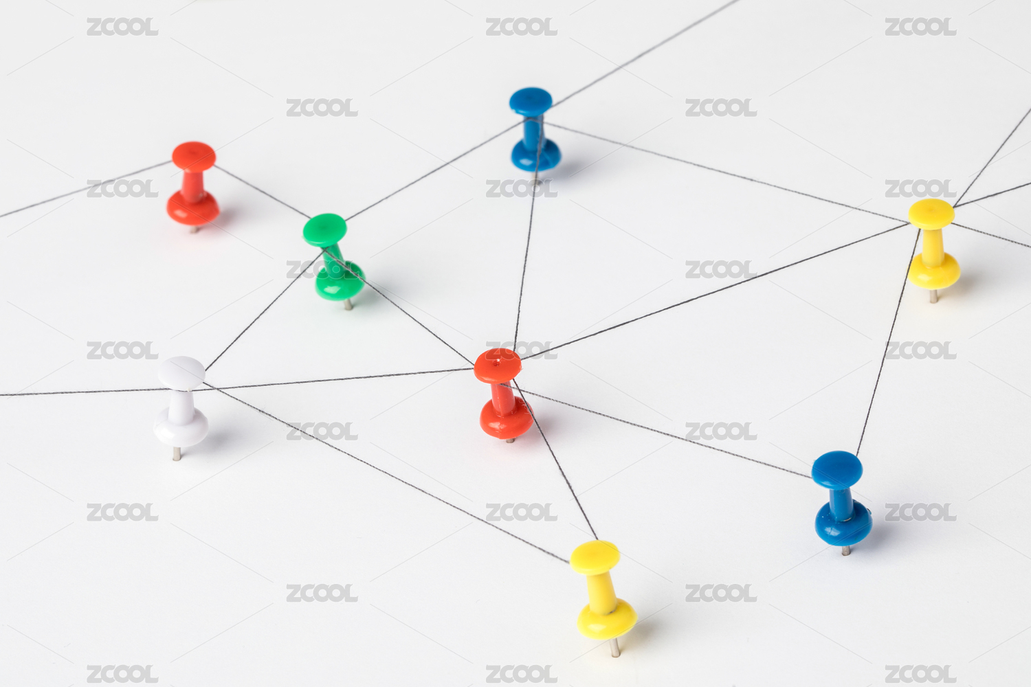 白背景上,線連接圖釘形成的關(guān)系網(wǎng)絡(luò)