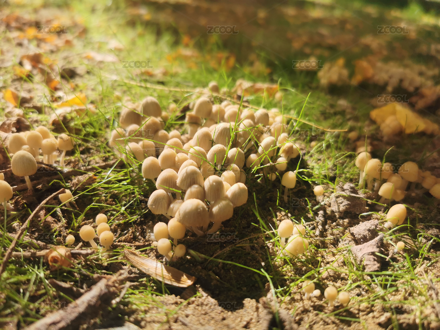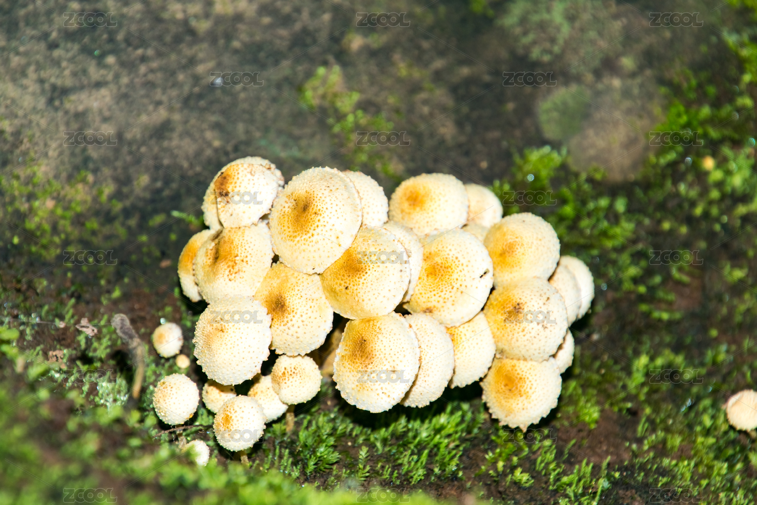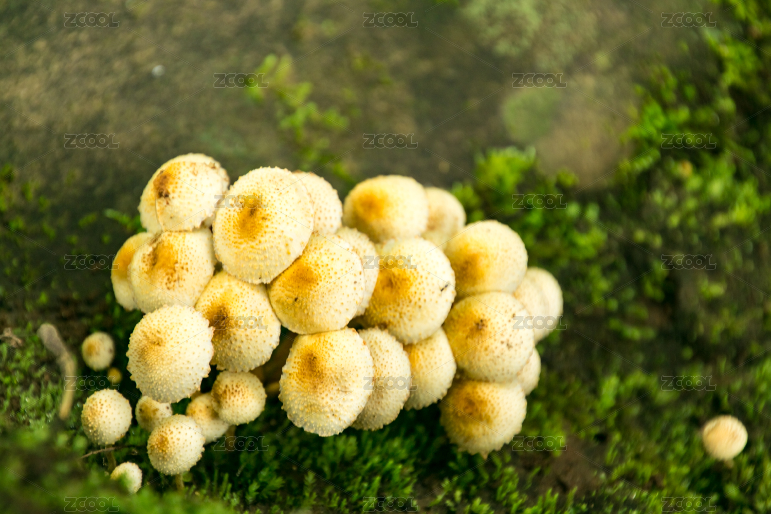 生長(zhǎng)在苔蘚上的野生菌菇近景特寫(xiě)