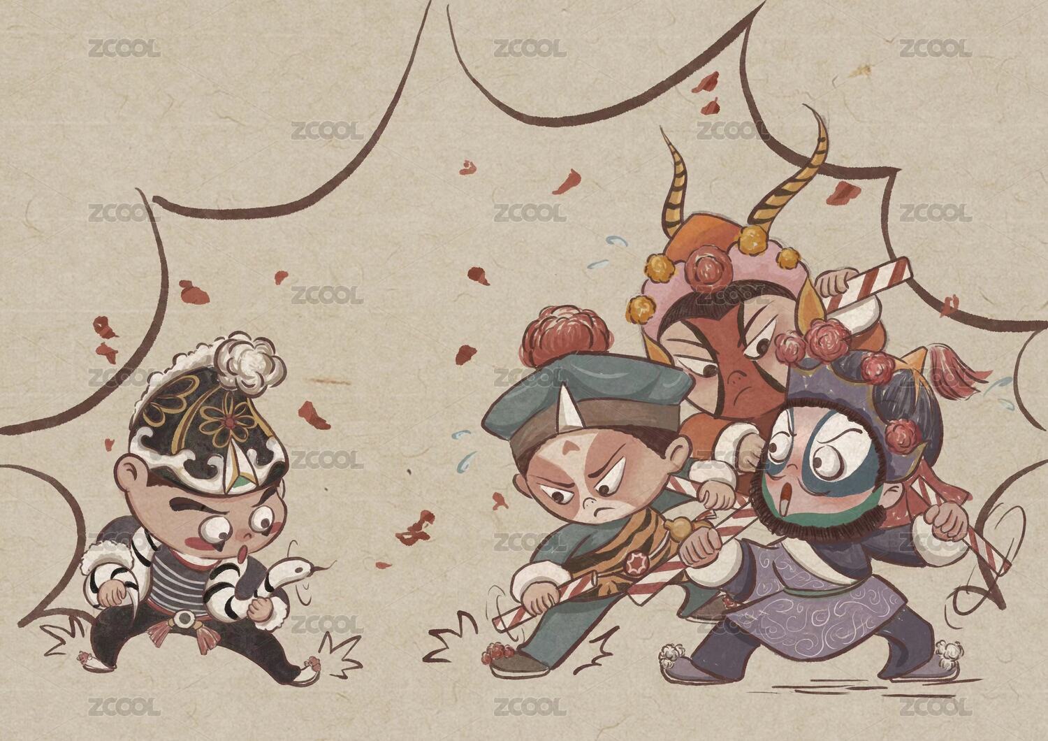 四個人畫著臉譜歡天喜地的跳英歌舞